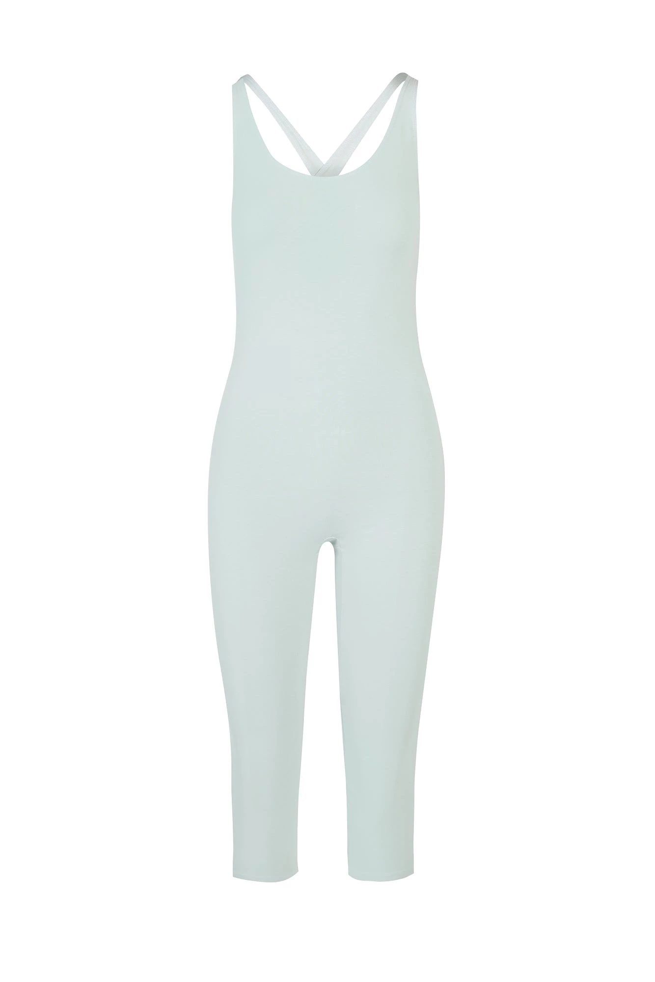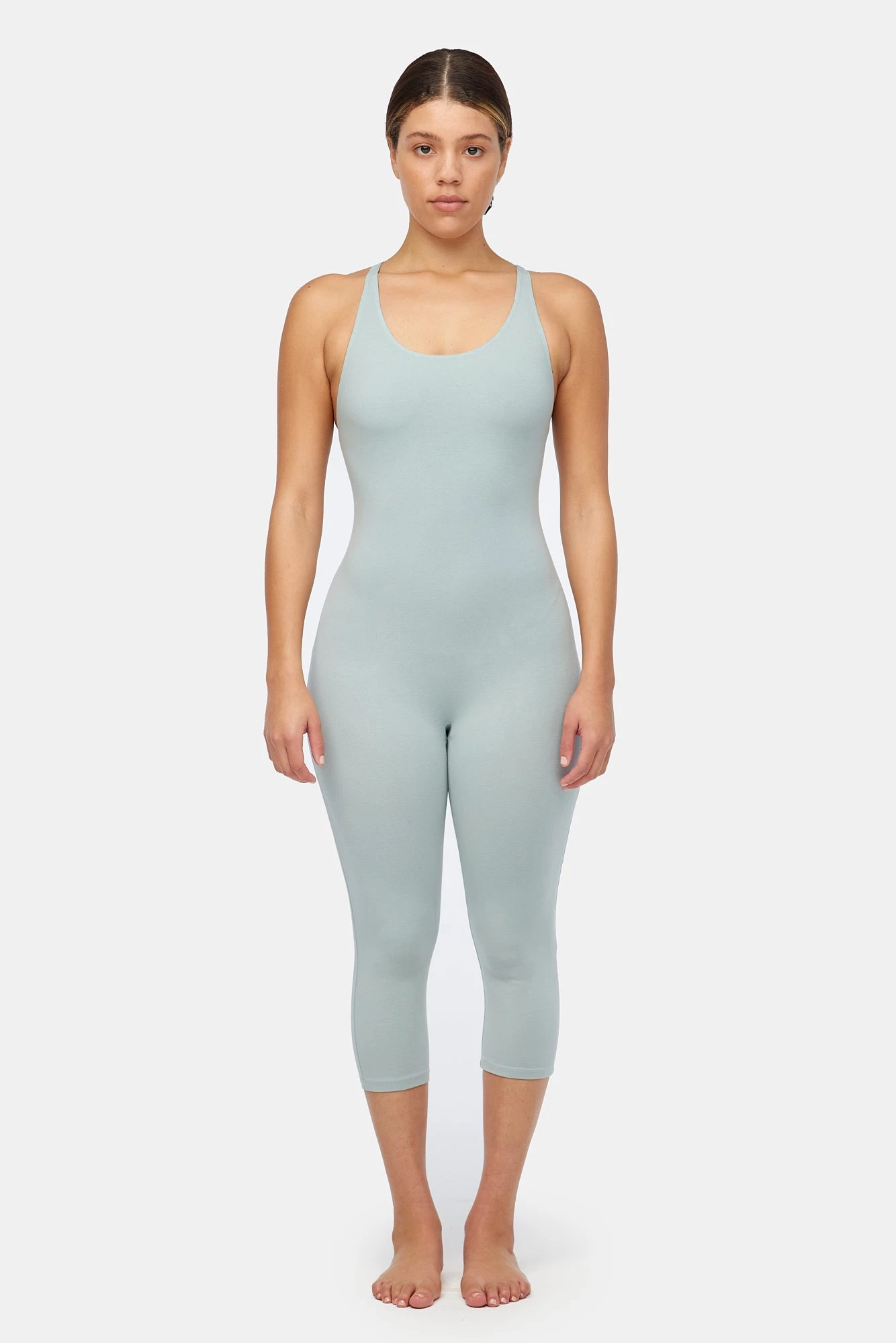 A cropped length active tank unitard with a scoop neck and criss cross open back. Made from Organic Flex, an organic cotton spandex blend for ultimate stretch and buttery softness to support you while you move.