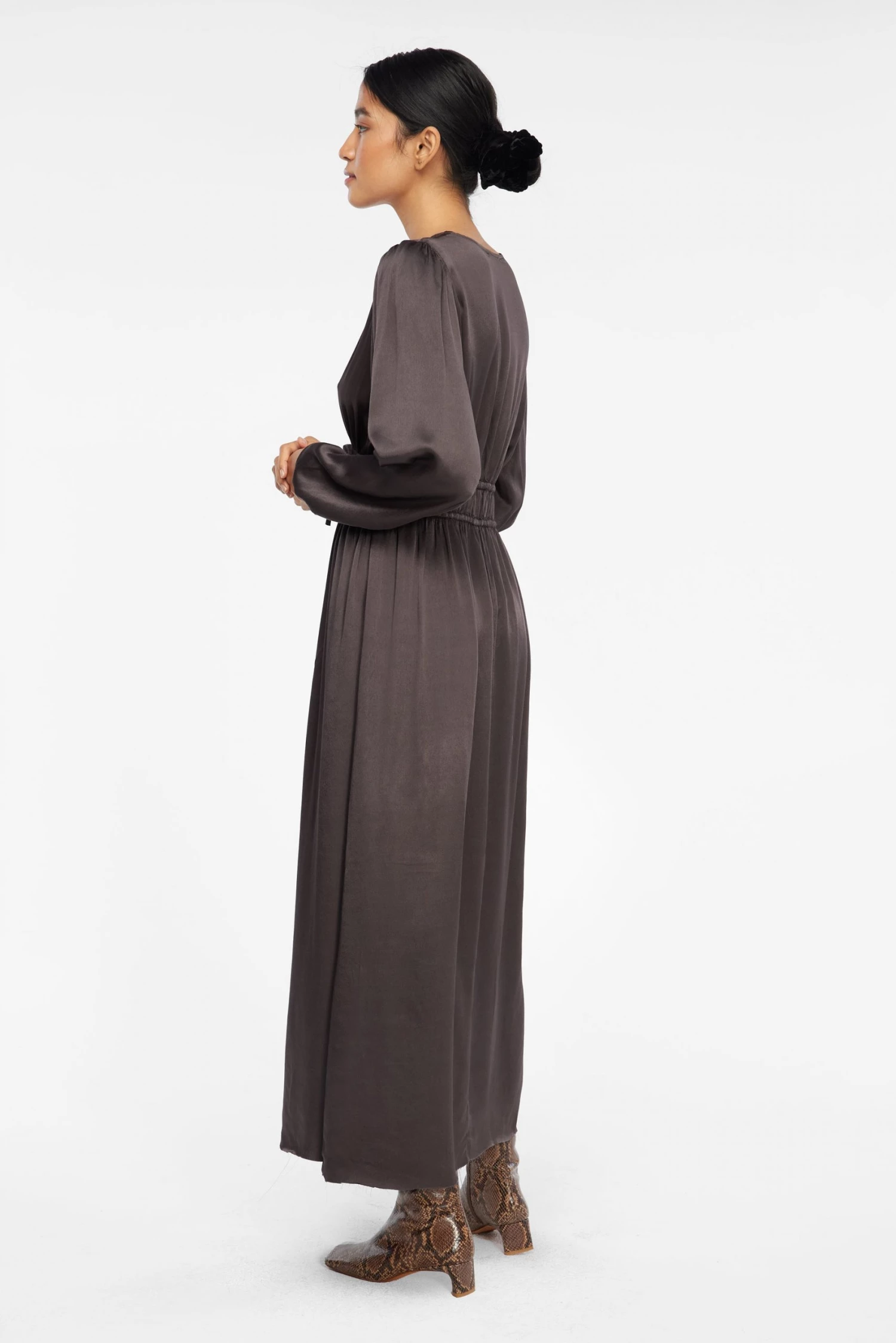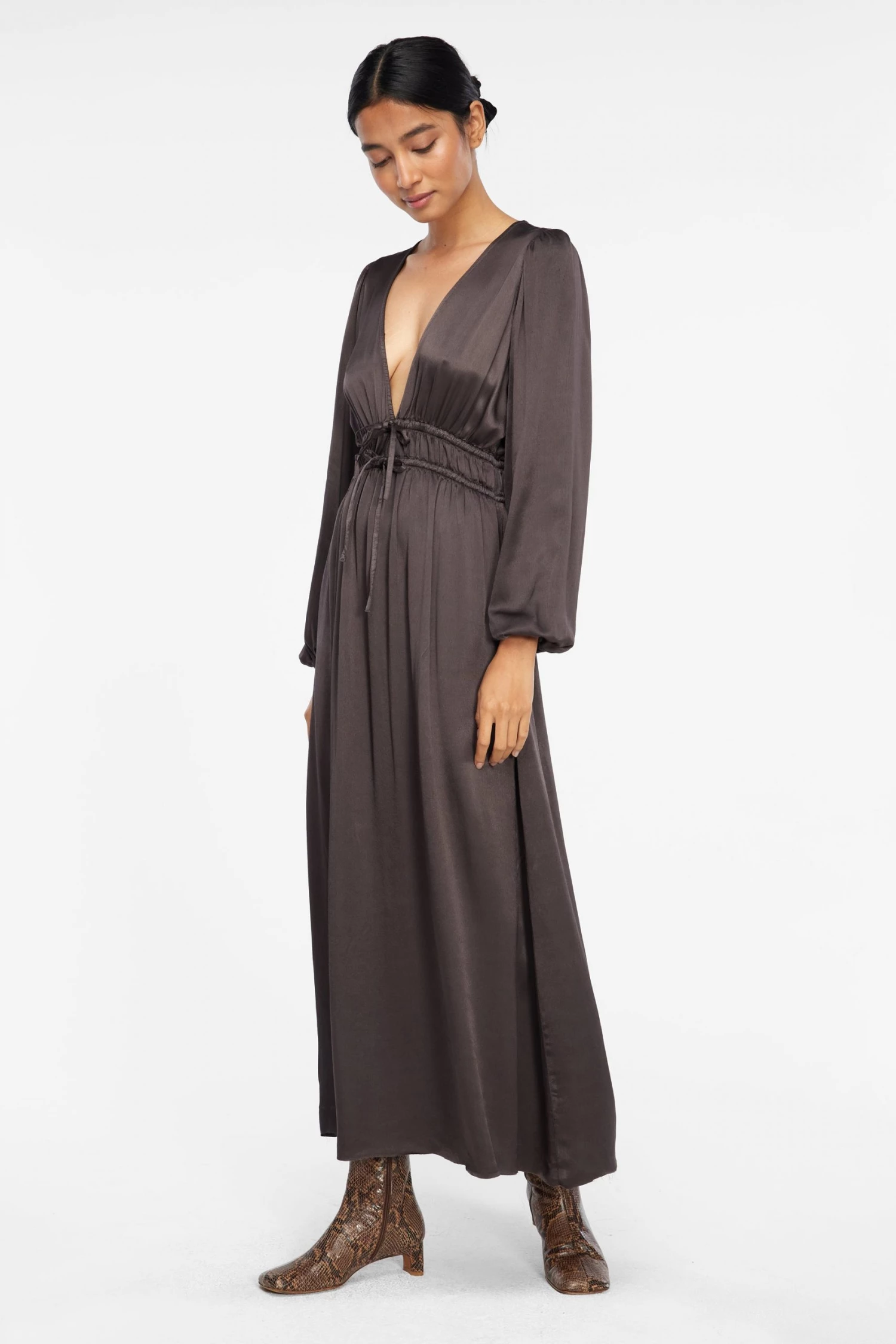 A gorgeous draped occasion dress with plunging neckline and adjustable drawstrings at waist for the most flattering but secure fit. Made from our insanely soft, garment dyed Martini Satin.