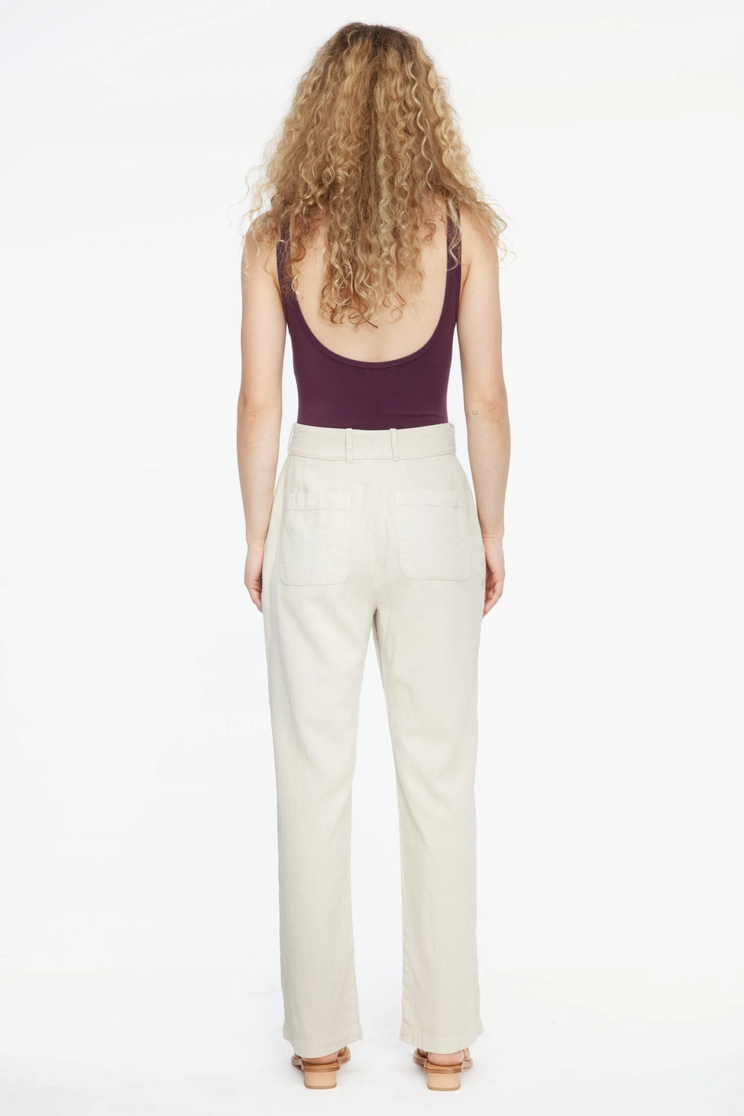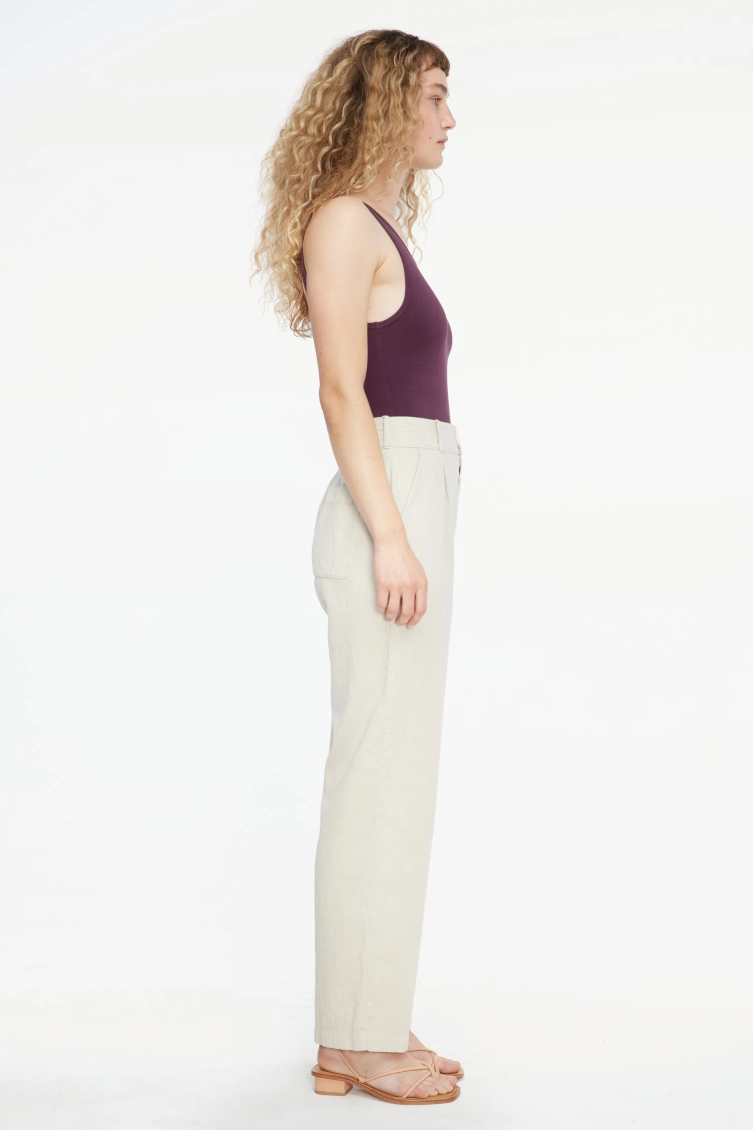 Classic everyday slacks with a wide waistband, full length, straight leg, button fly and subtle pleats. Made in a lightweight, textured cotton/tencel blend canvas.
