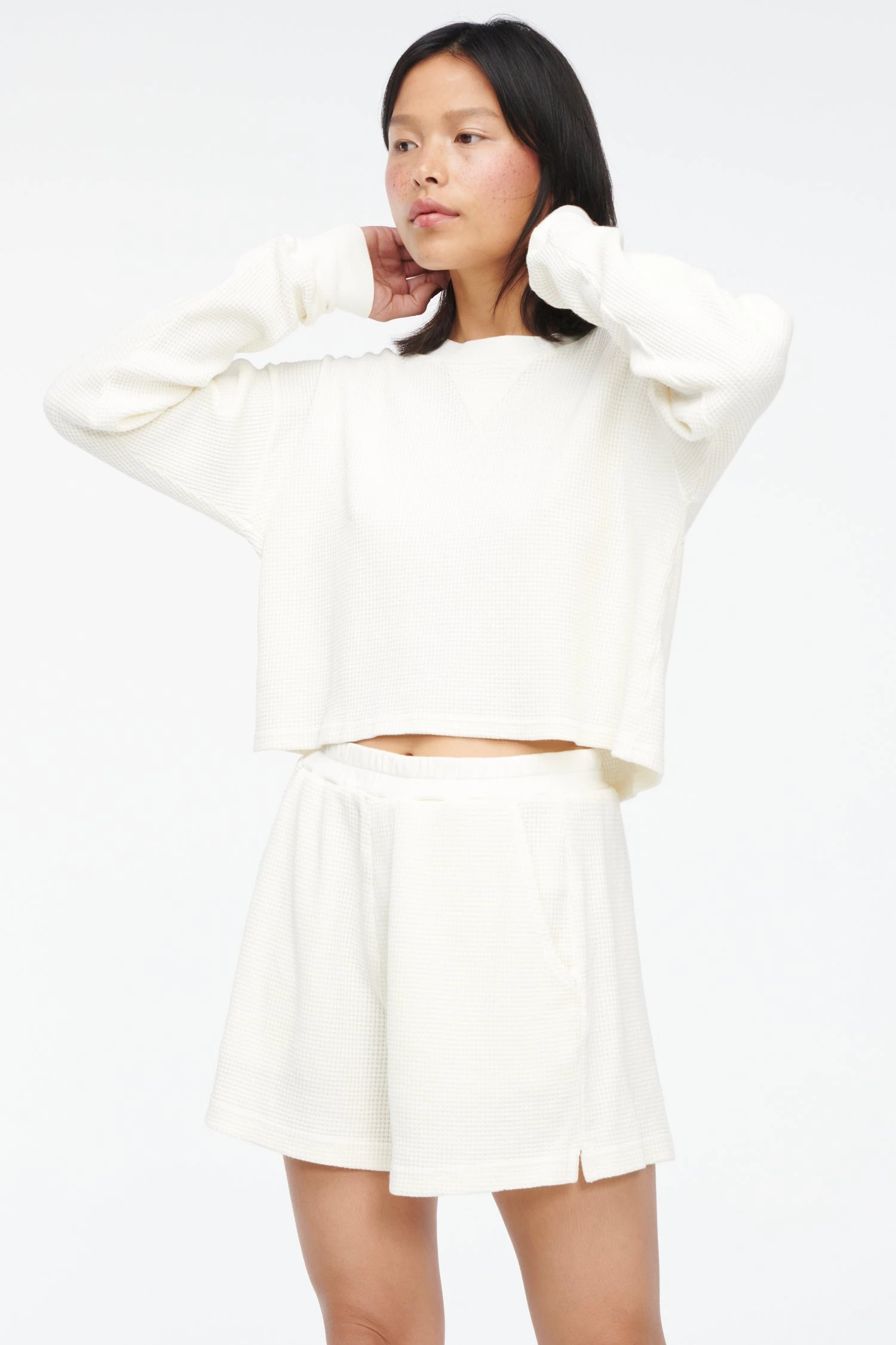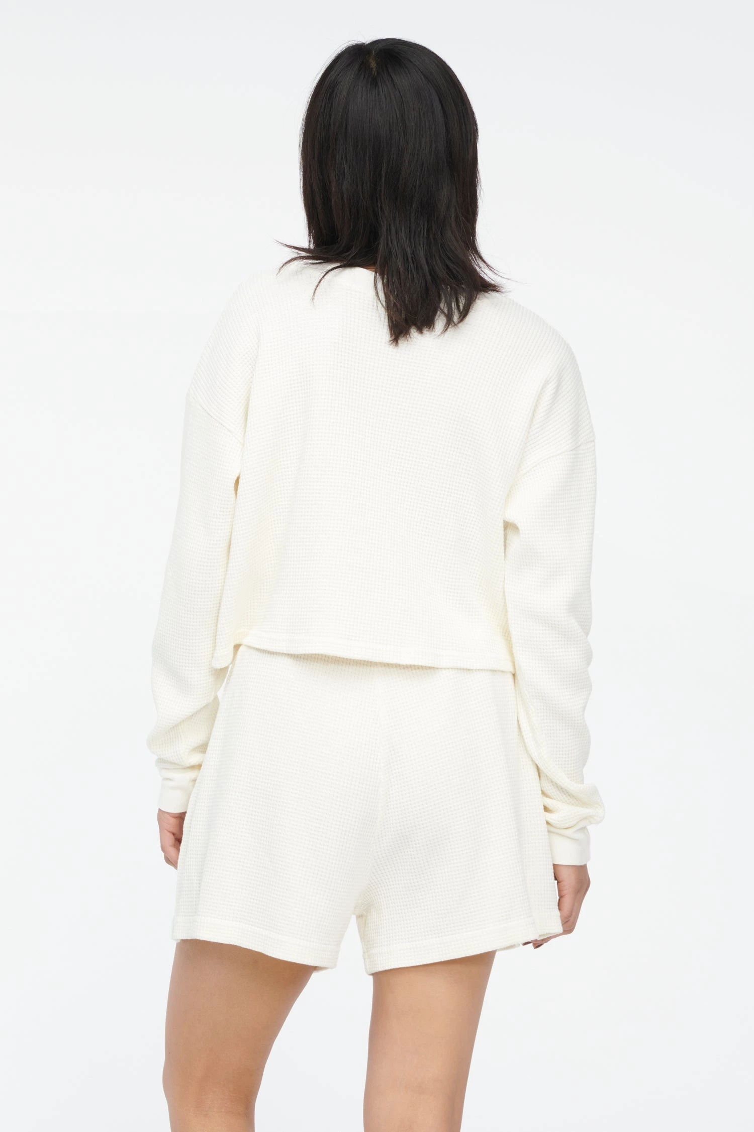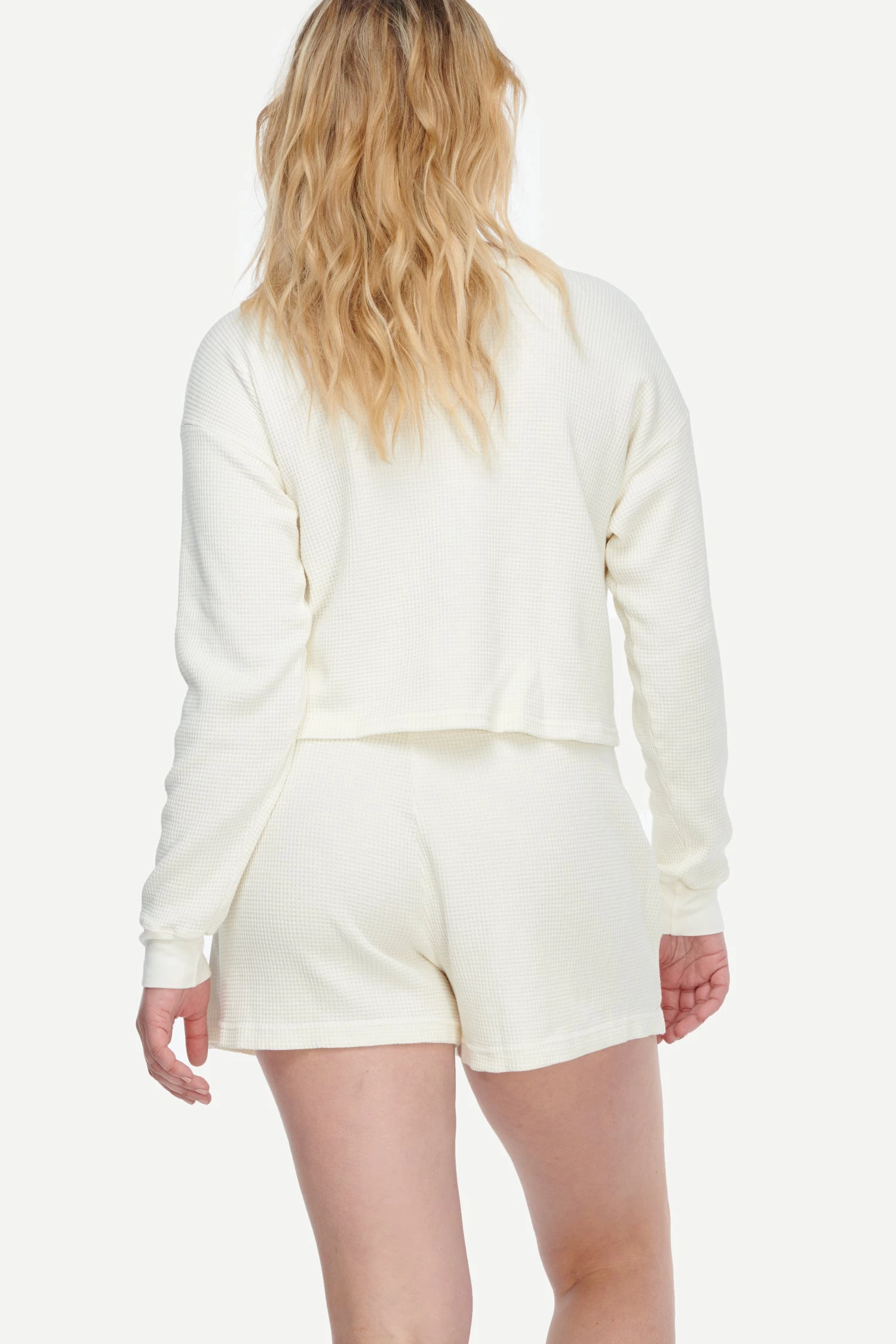 The comfiest thermal crewneck tee. Slightly cropped with a boxy fit. Made from insanely soft Cotton Modal blend thermal knit. Pair with the Dakota Thermal Shorts for the cutest, coziest lounge fit.