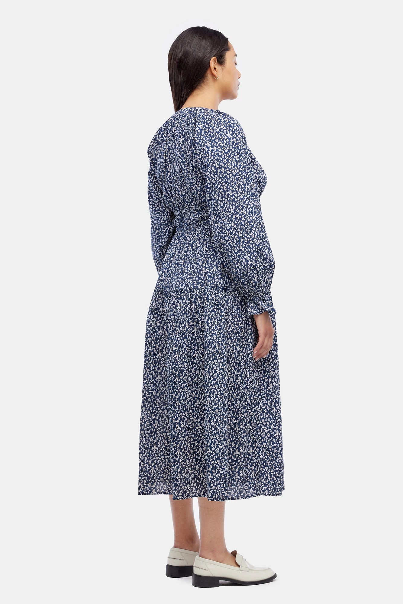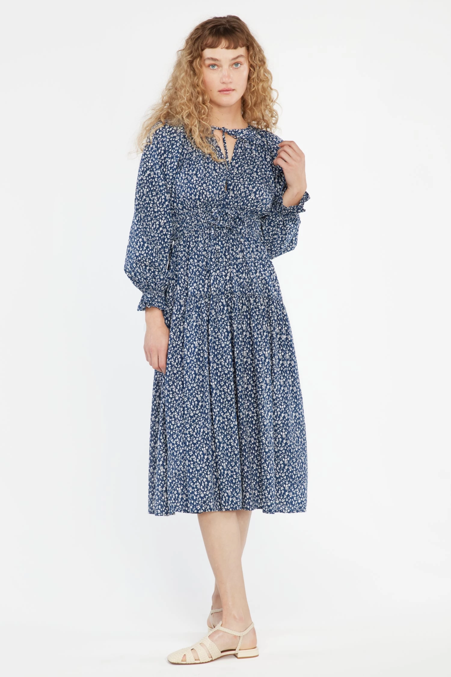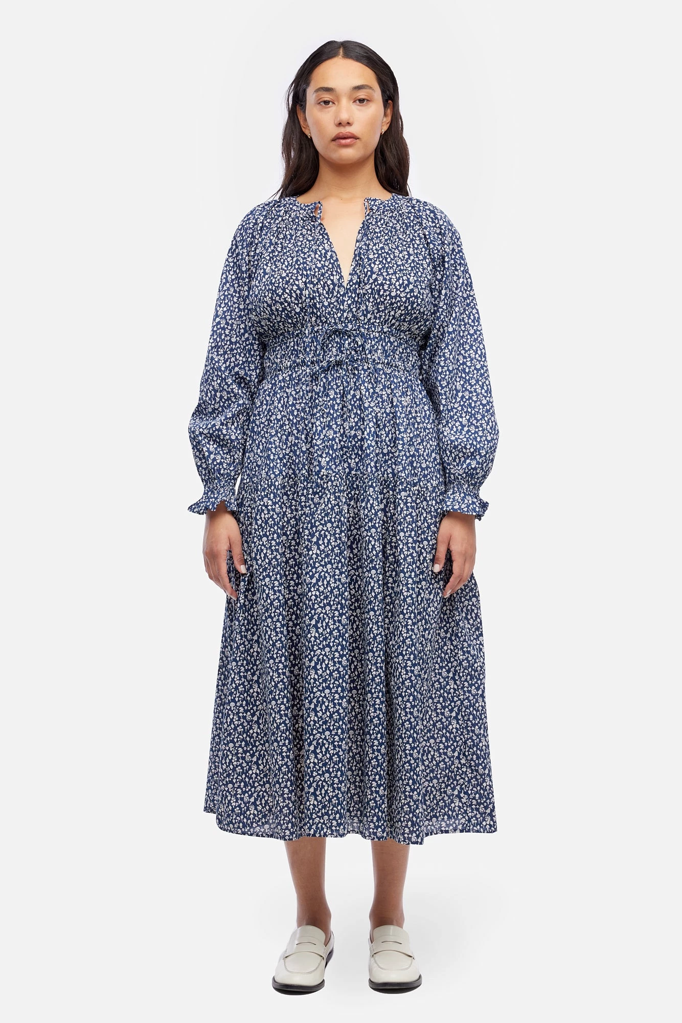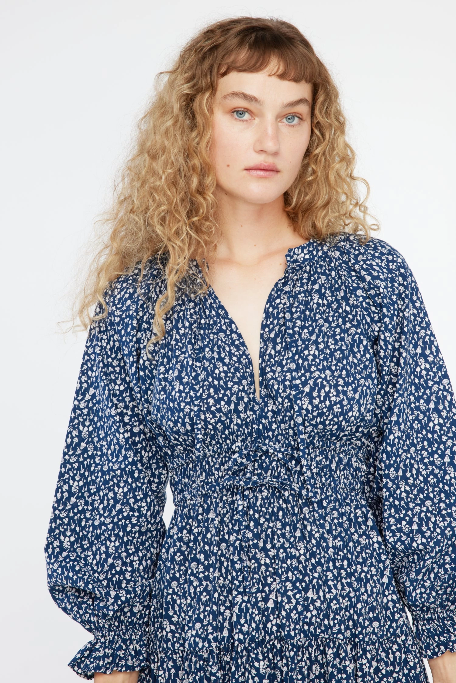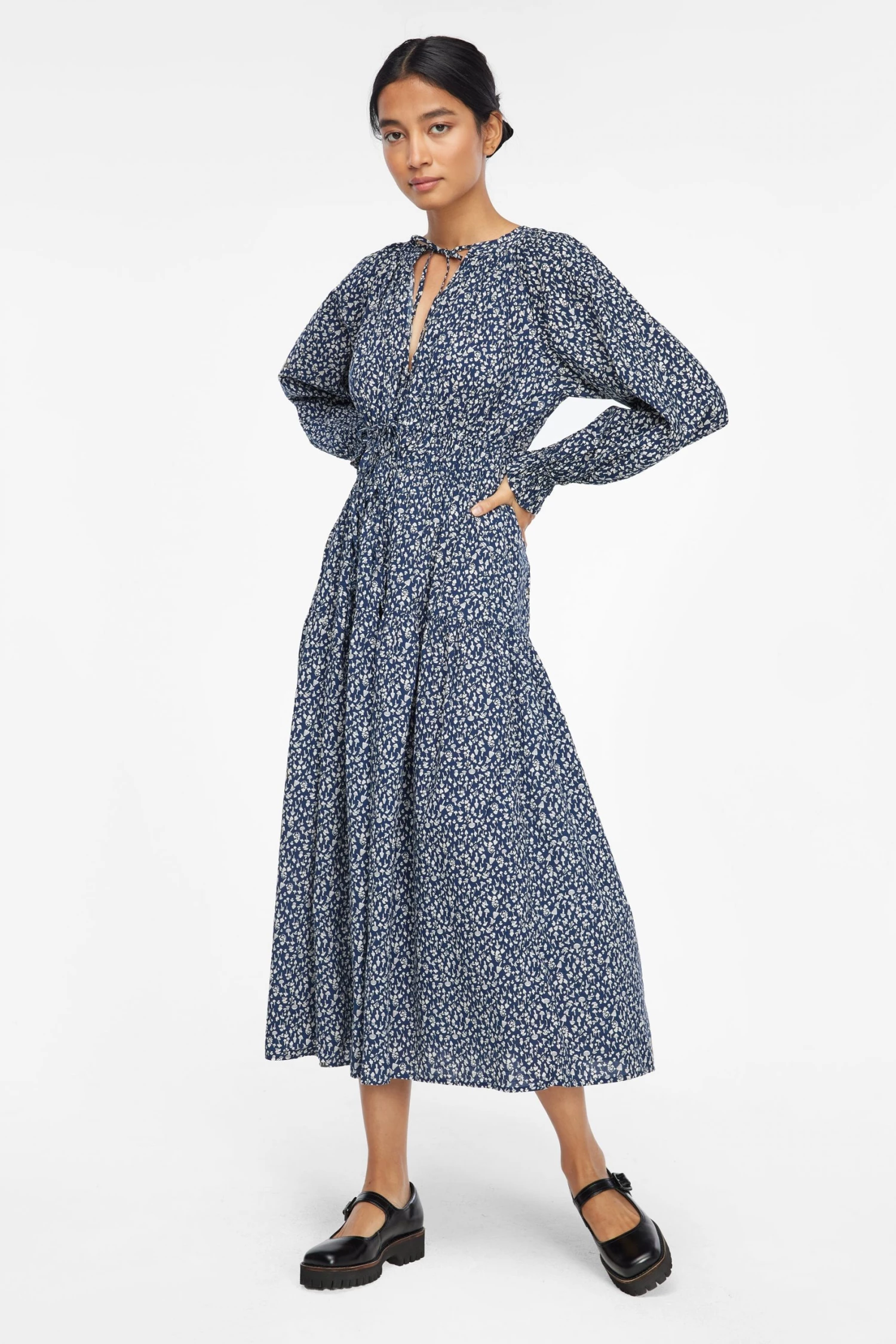 A romantic midi dress in lightweight cotton featuring teeny tiny mushroom print. A cozy relaxed fit with adjustable ties to highlight the most flattering part of your wait. A deep v neckline with adjustable tie at the top. Guaranteed showstopper. Â