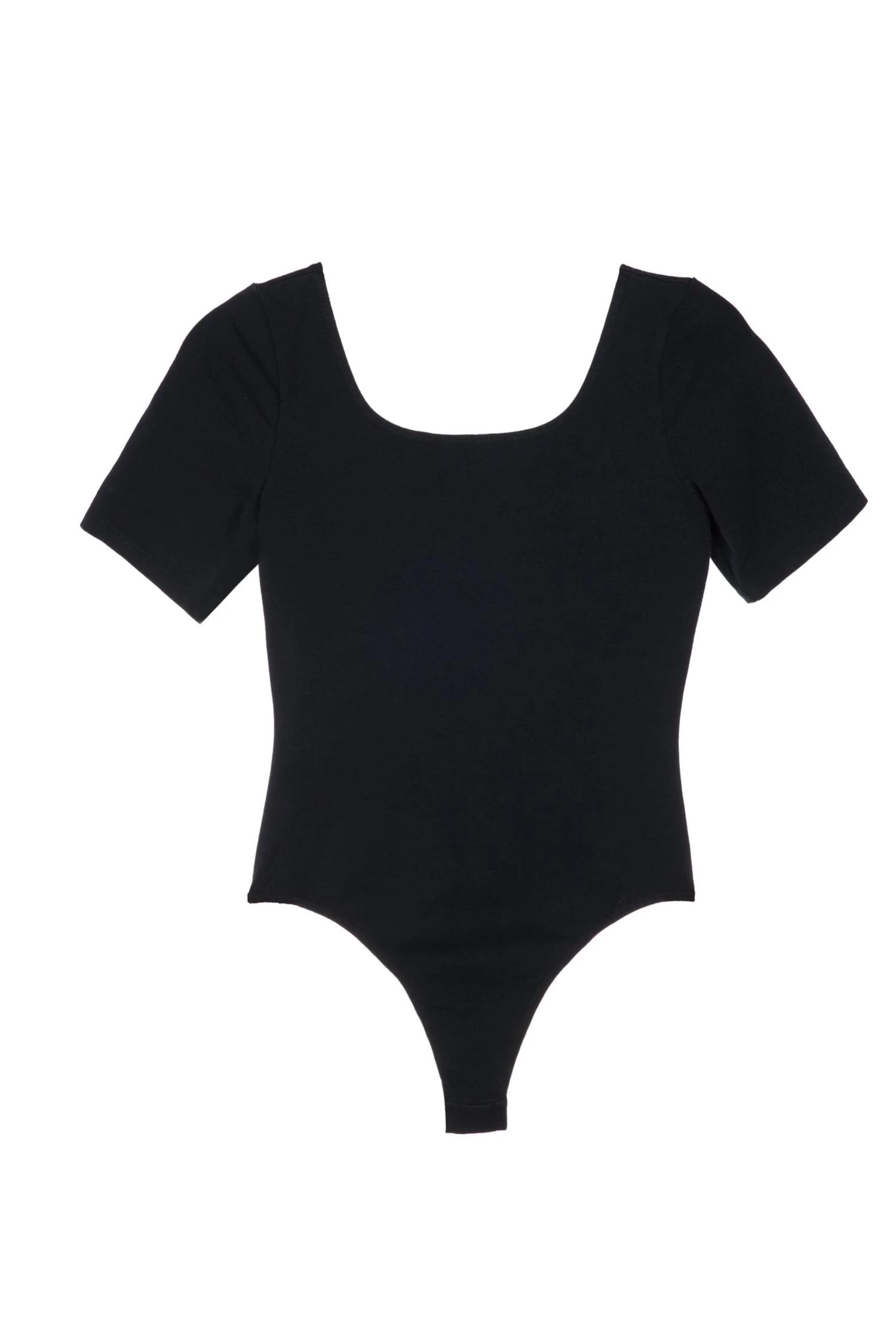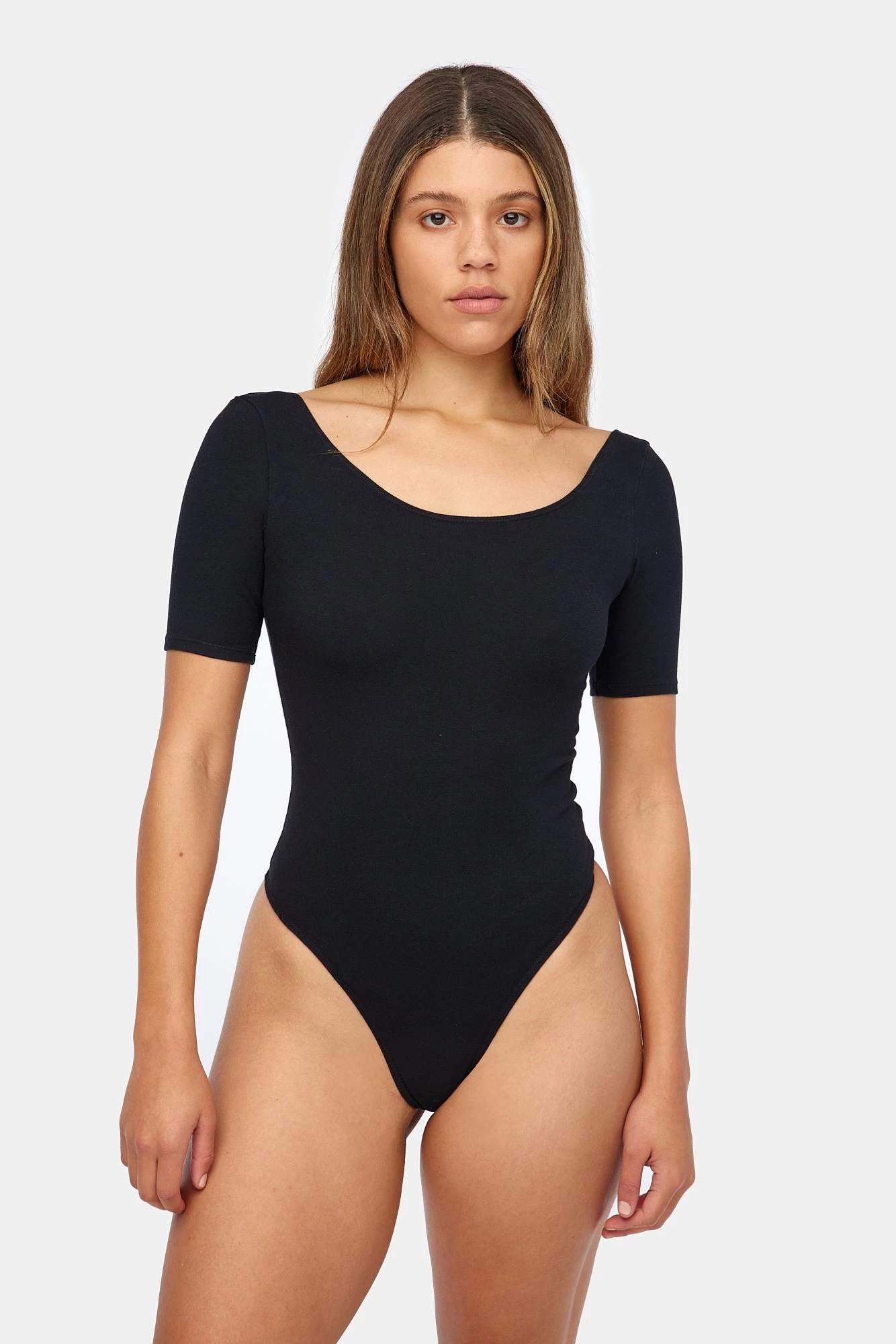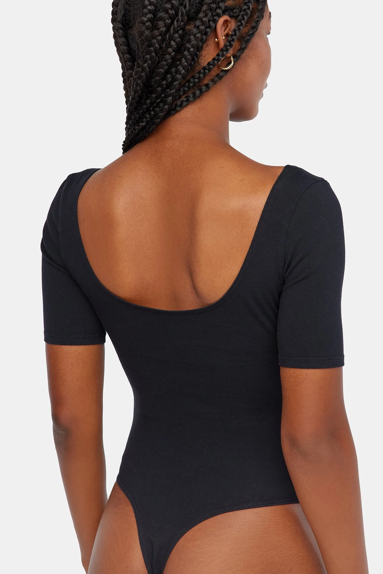 An absolute essential. A fitted bodysuit with short sleeves, a feminine flattering neckline and scoop back. Thong bottom for the best fit under your favorite trousers. Made from our Organic Flex fabric for support and the most buttery soft feel.