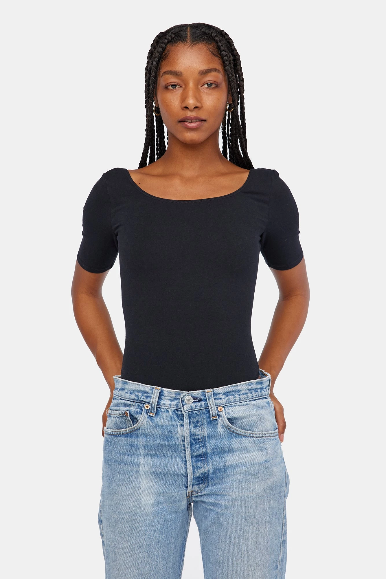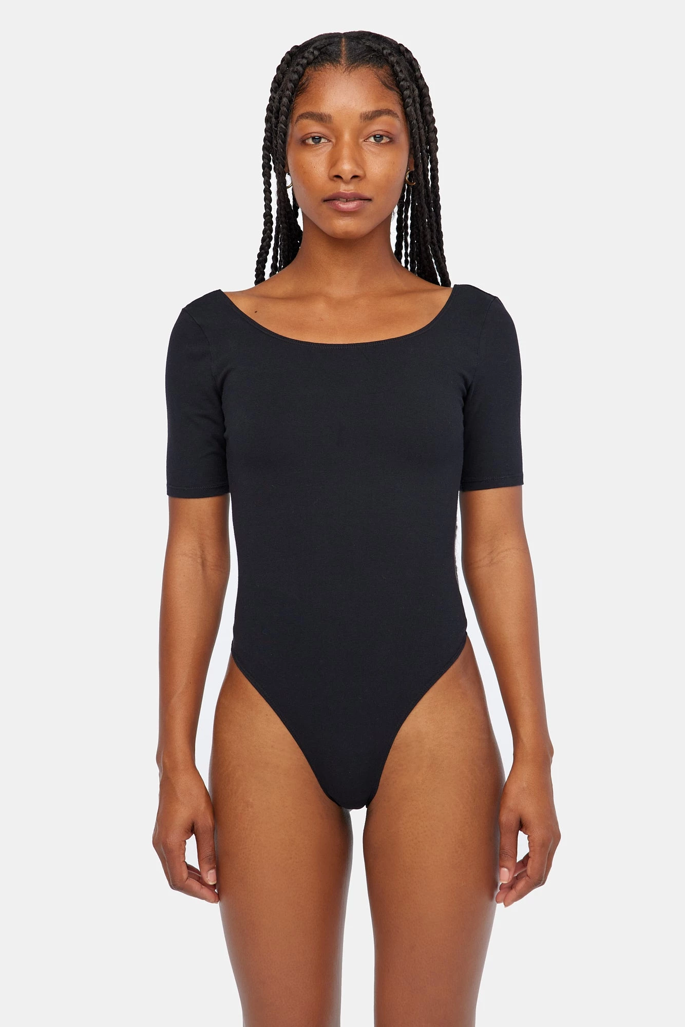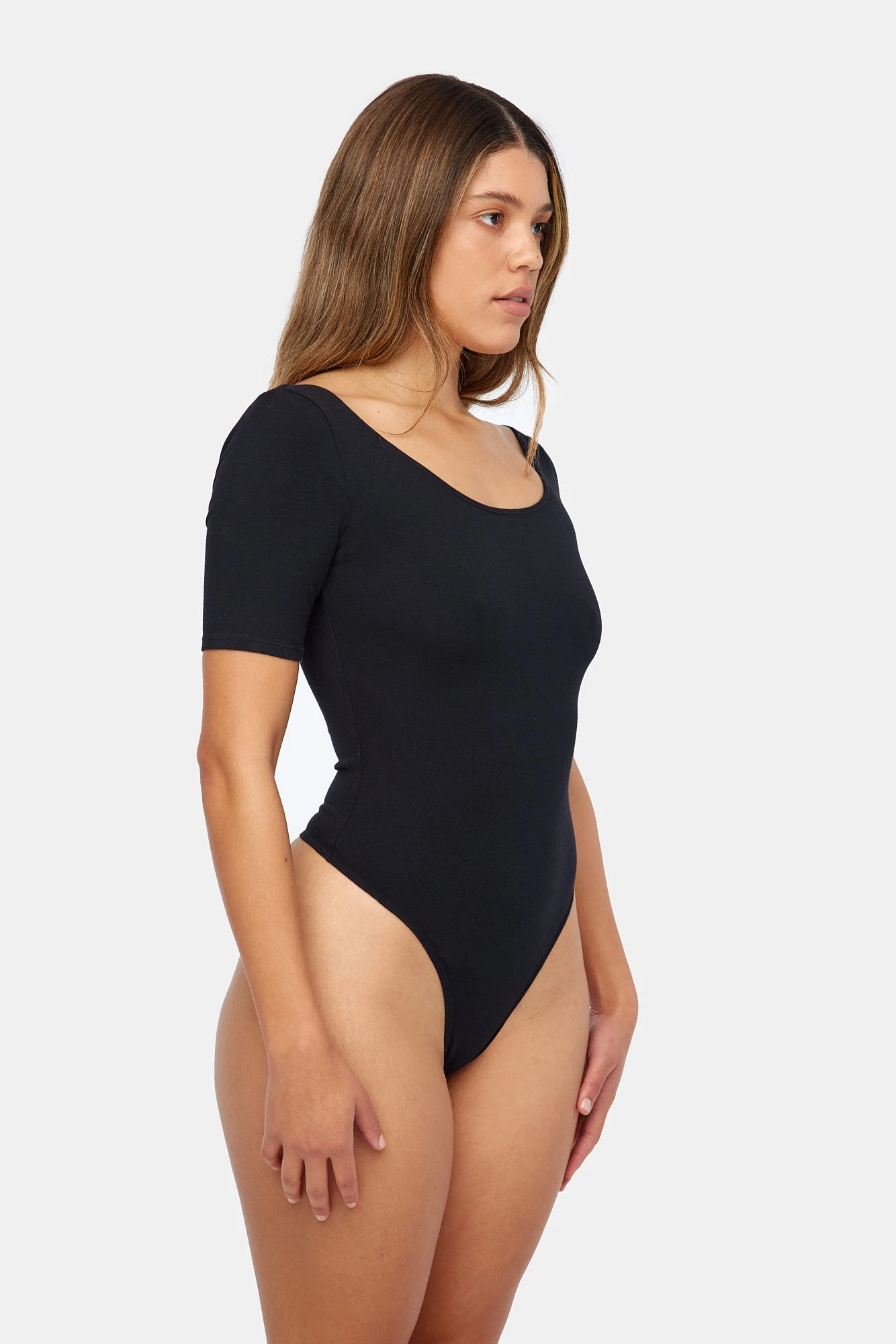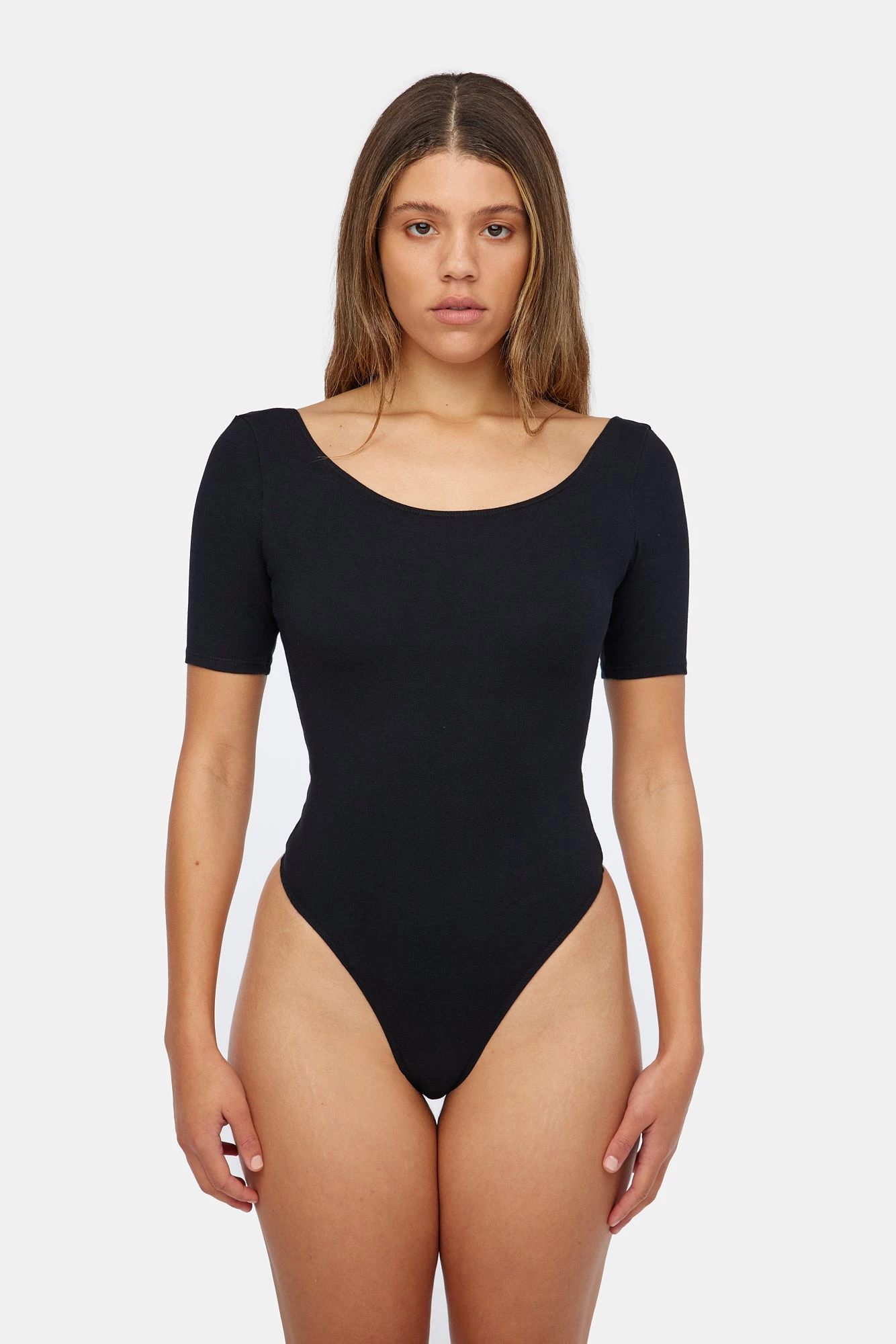 An absolute essential. A fitted bodysuit with short sleeves, a feminine flattering neckline and scoop back. Thong bottom for the best fit under your favorite trousers. Made from our Organic Flex fabric for support and the most buttery soft feel.