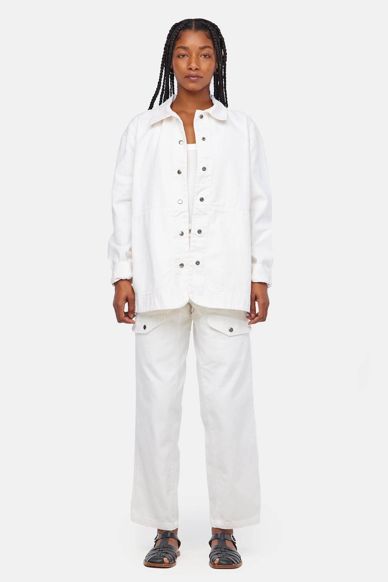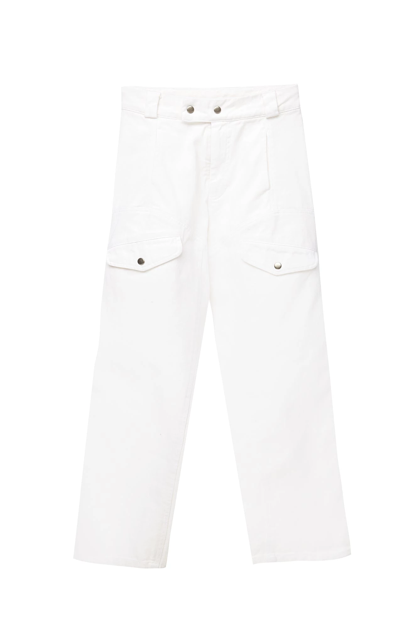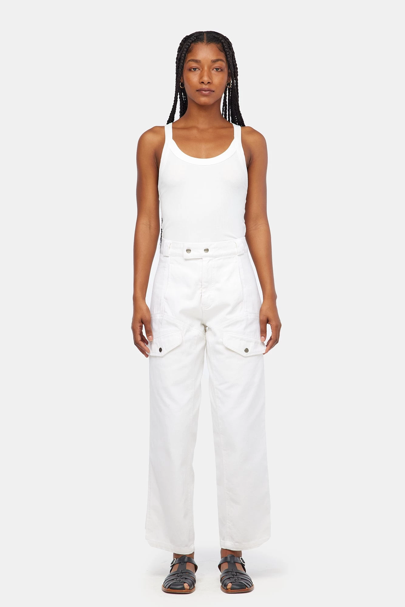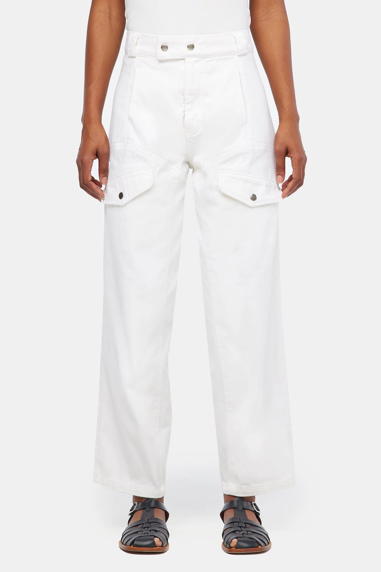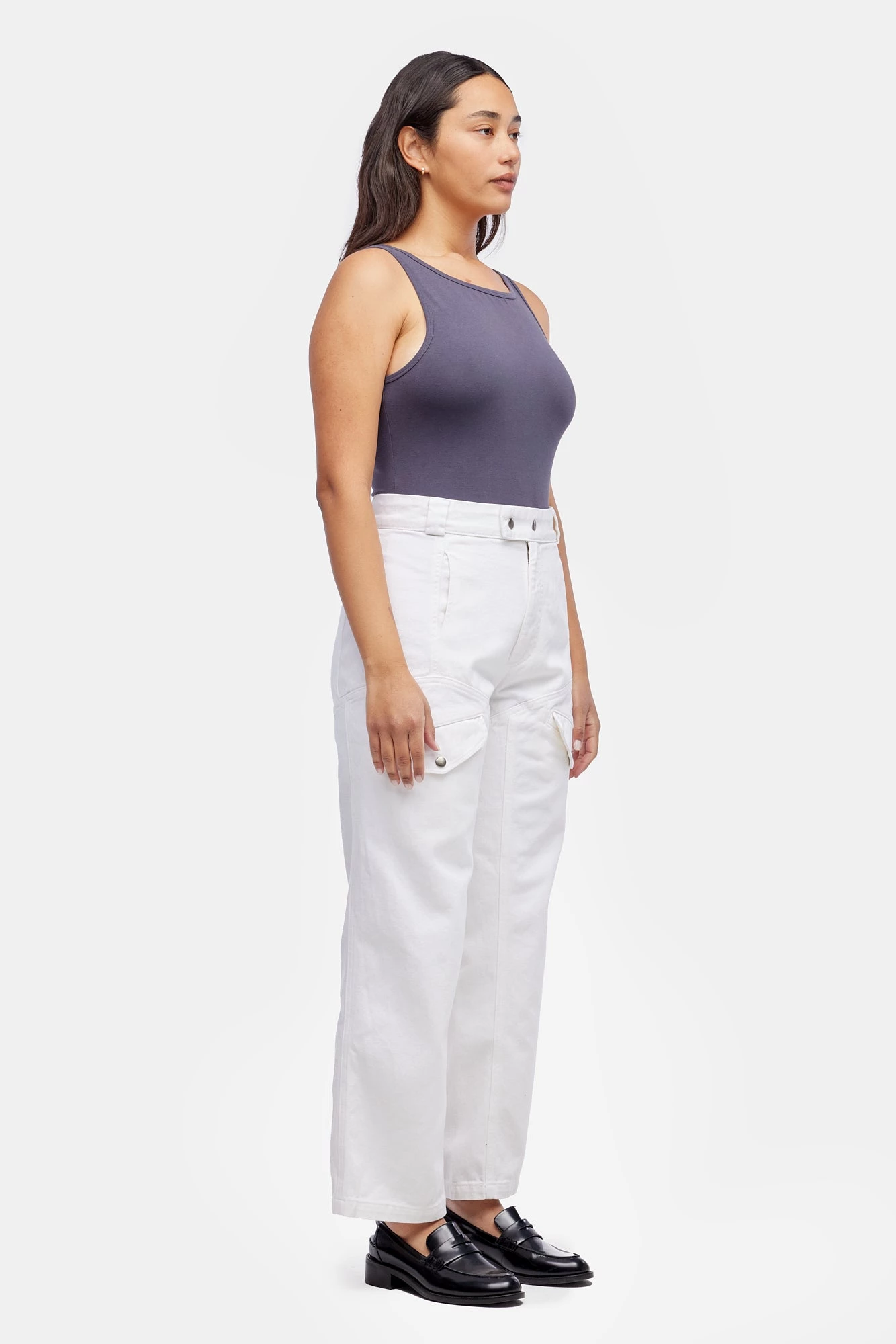 Vintage menswear inspired four pocket work pants with seam details on front and back, zipper fly with snap closure. High rise with a straight, slightly tapered leg for a flattering, feminine fit. Made from garment dyed bull denim.