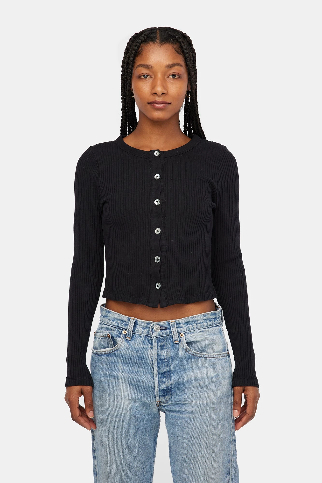 A 90s inspired fitting cardigan with contrast buttons and slightly cropped fit. Made from our very own engineered rib.