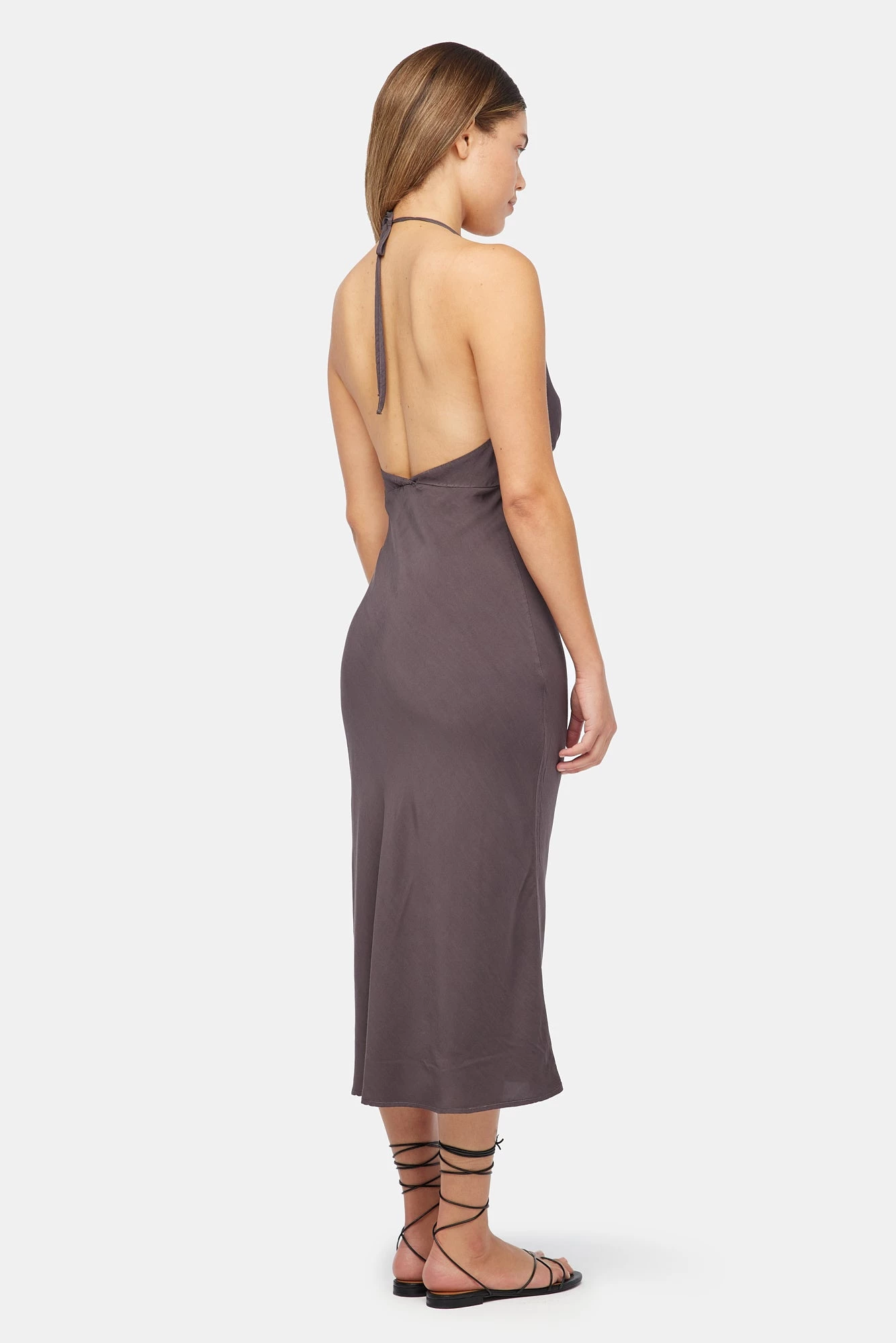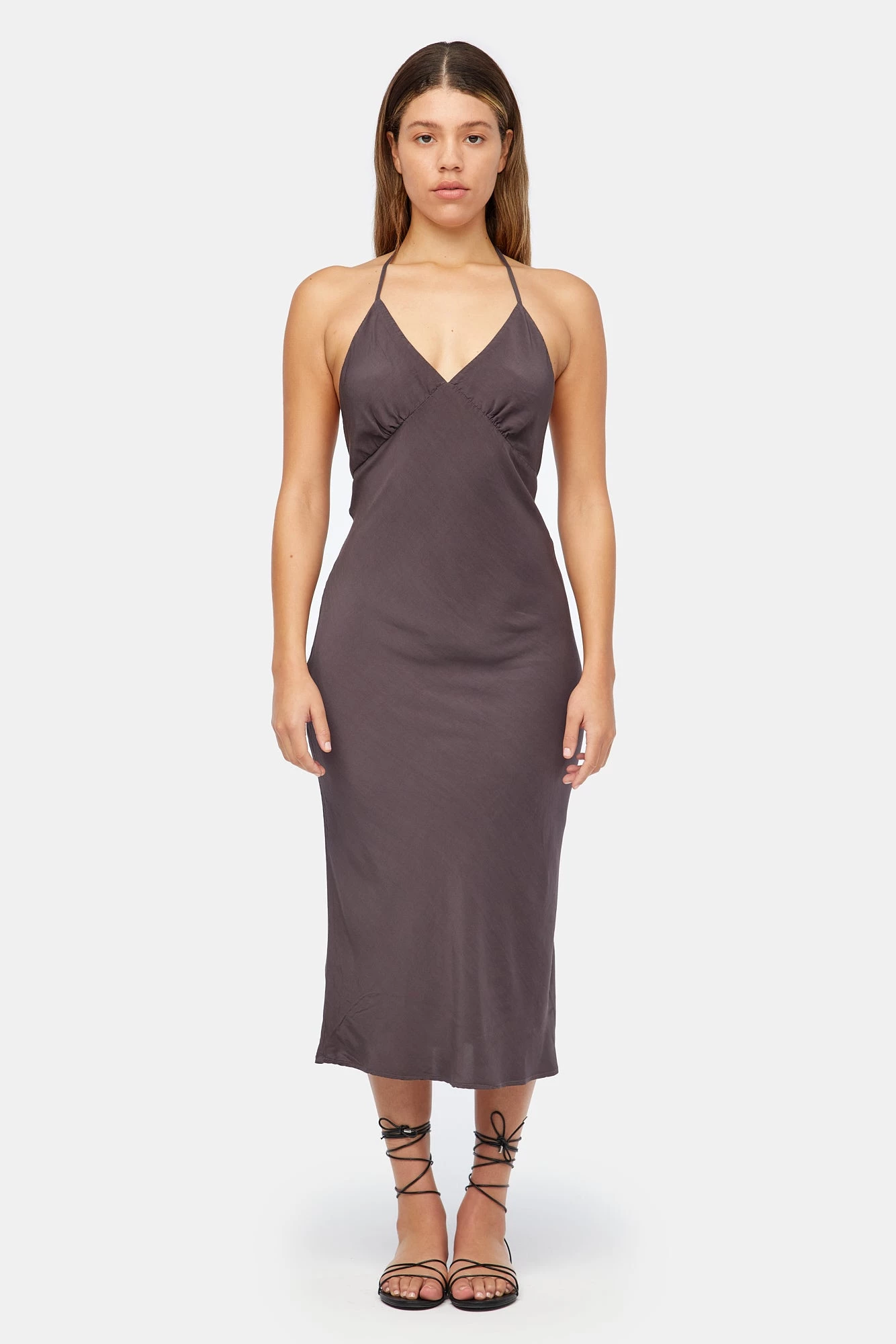 A classic bias cut halter slip dress in a midi length. This technique of cutting fabric at a 45 degree angle allows it to softly drape over the body to fit comfortable and flatter your natural curves.