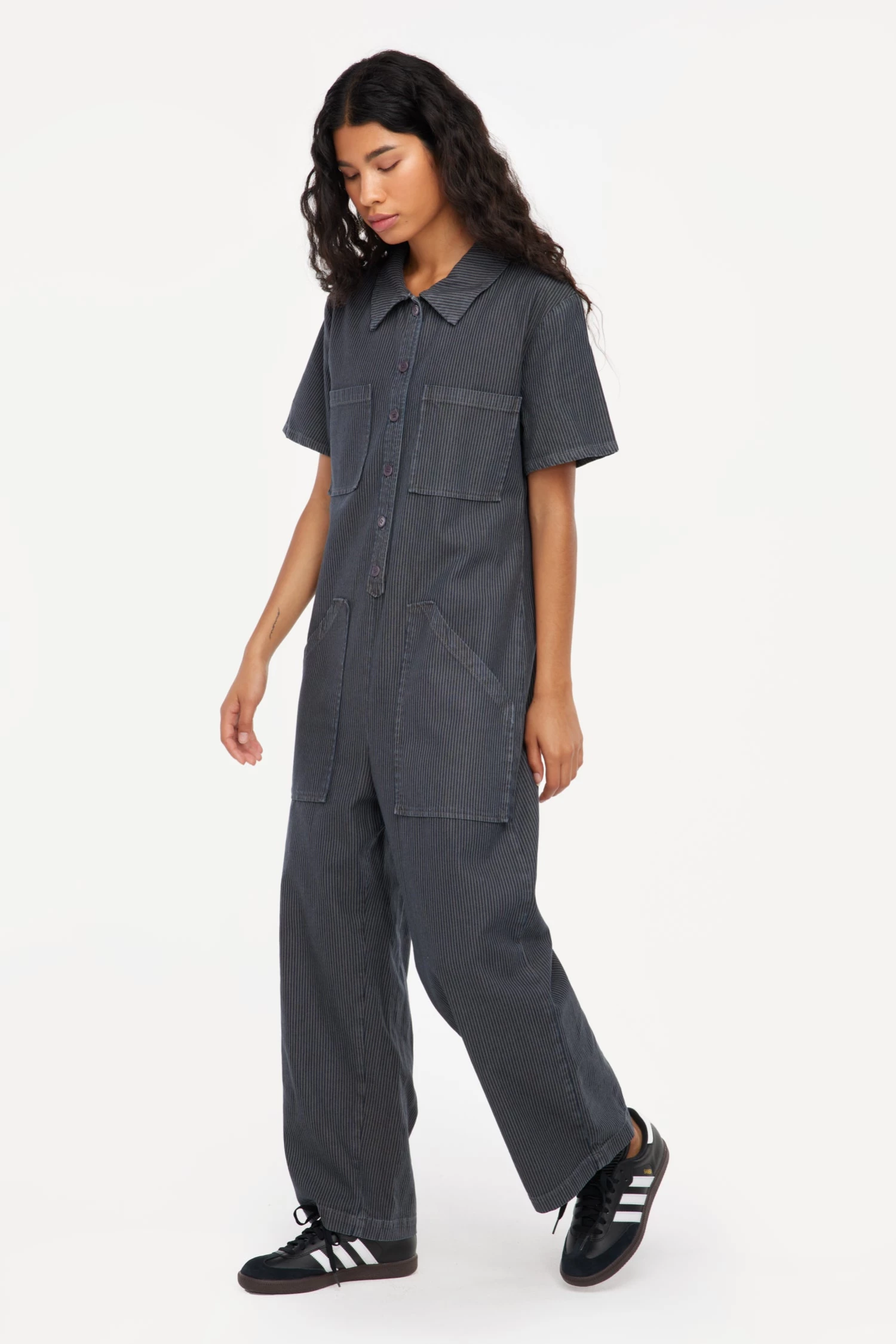 A fresh twist on our Lucky Jumpsuit. Made in a light weight railroad striped twill, with a straight, loose fit, short sleeves and buttons up the front.