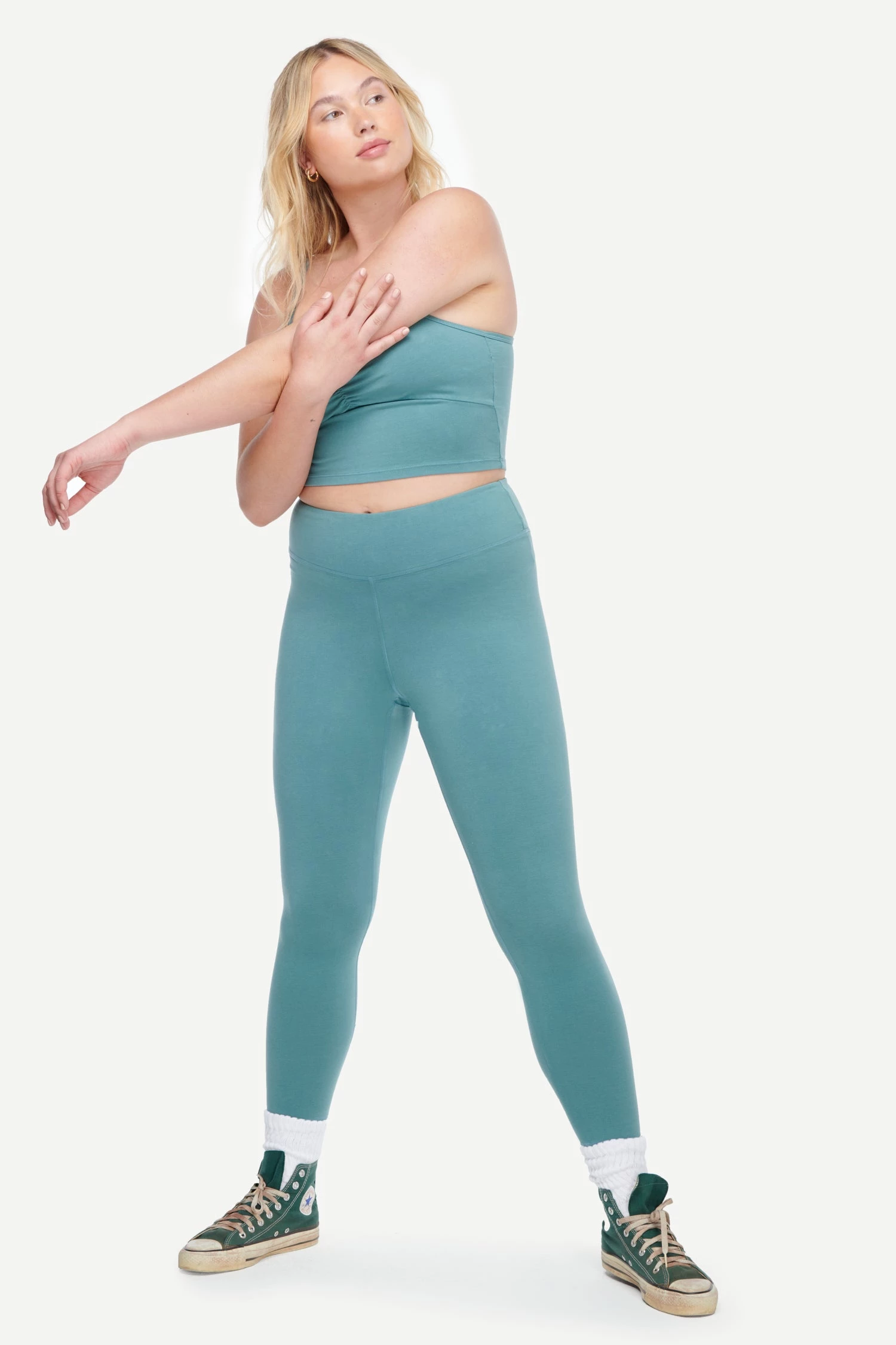 Garment dyed, high rise legging with flat lock stitching for added reinforcement at seams. The waist seam is curved at the sides to frame the slimmest part of your body. Super stretchy and buttery soft to support you throughout your lower impact workouts.