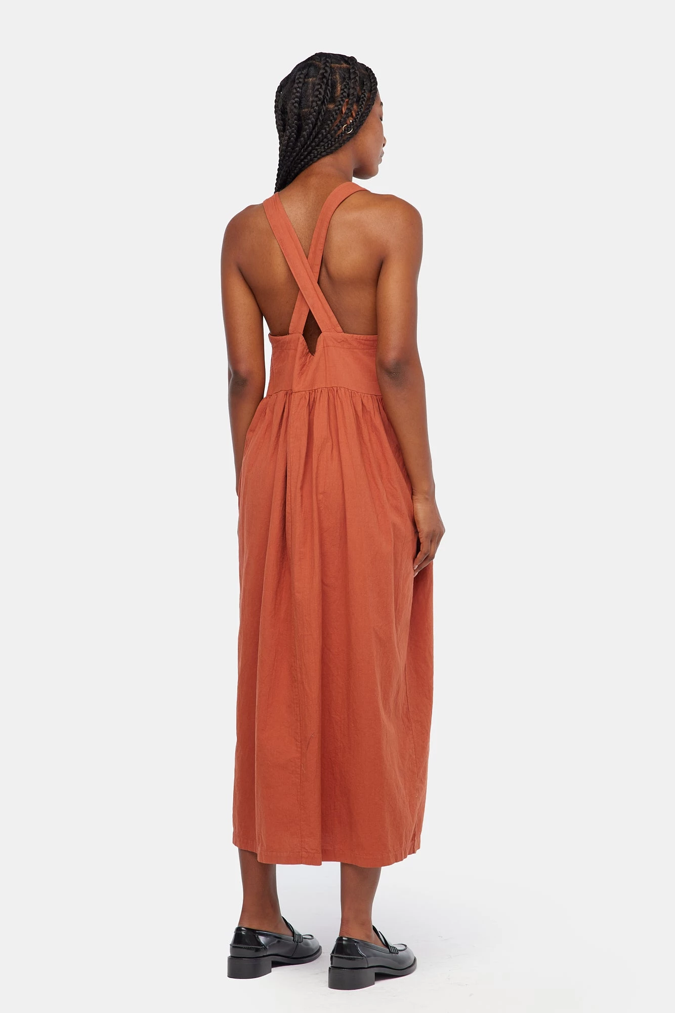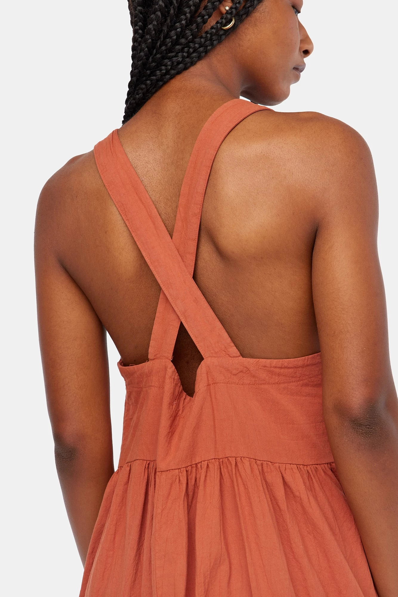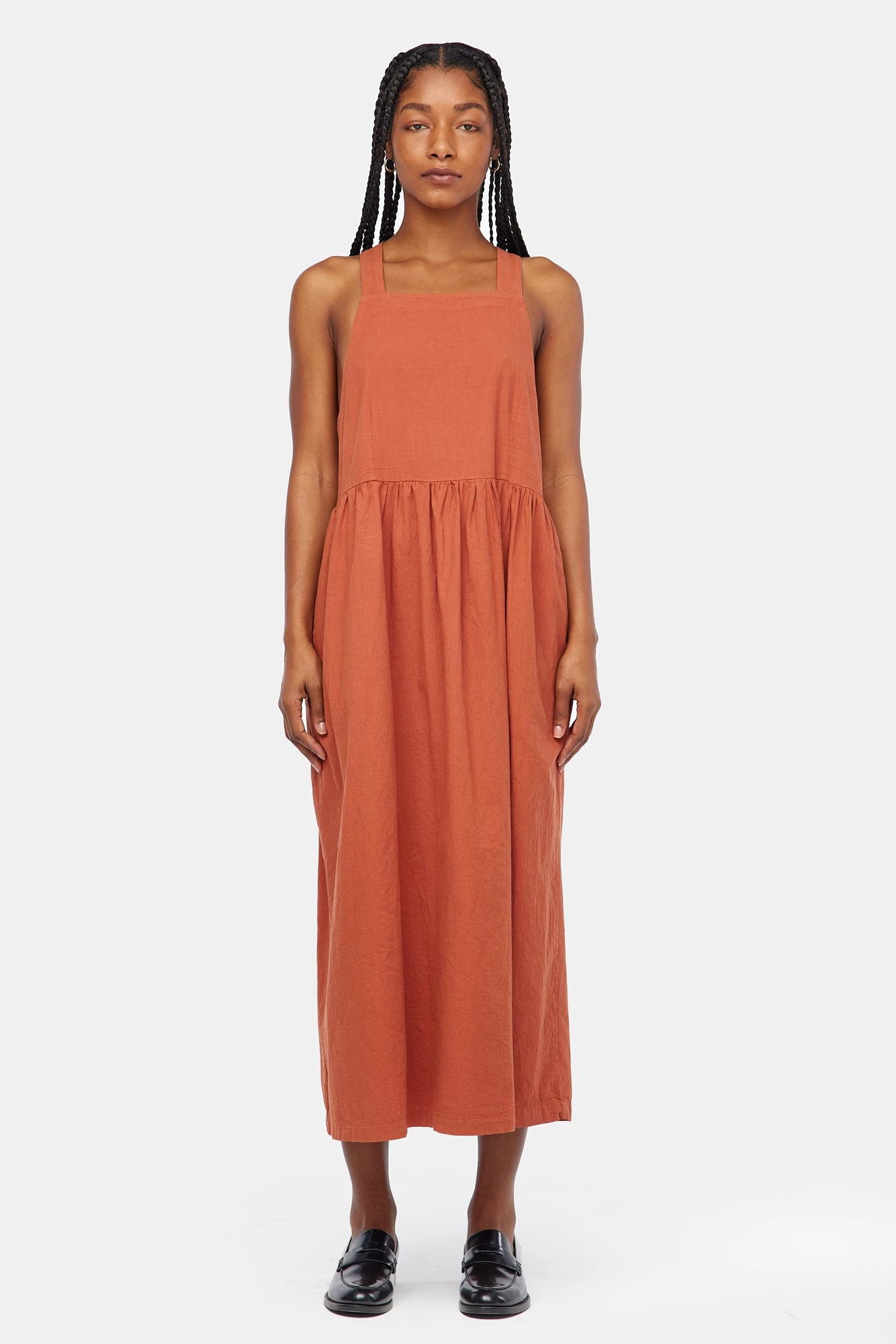 Our take on an apron dress with a chic square neckline, cross cross back and full skirt. Made from super soft, textured crinkled cotton. Did we mention it has pockets?