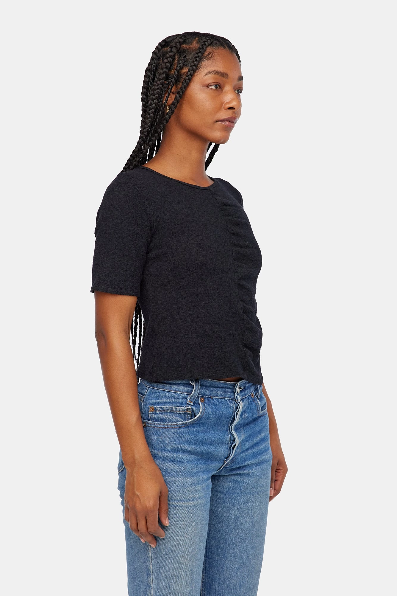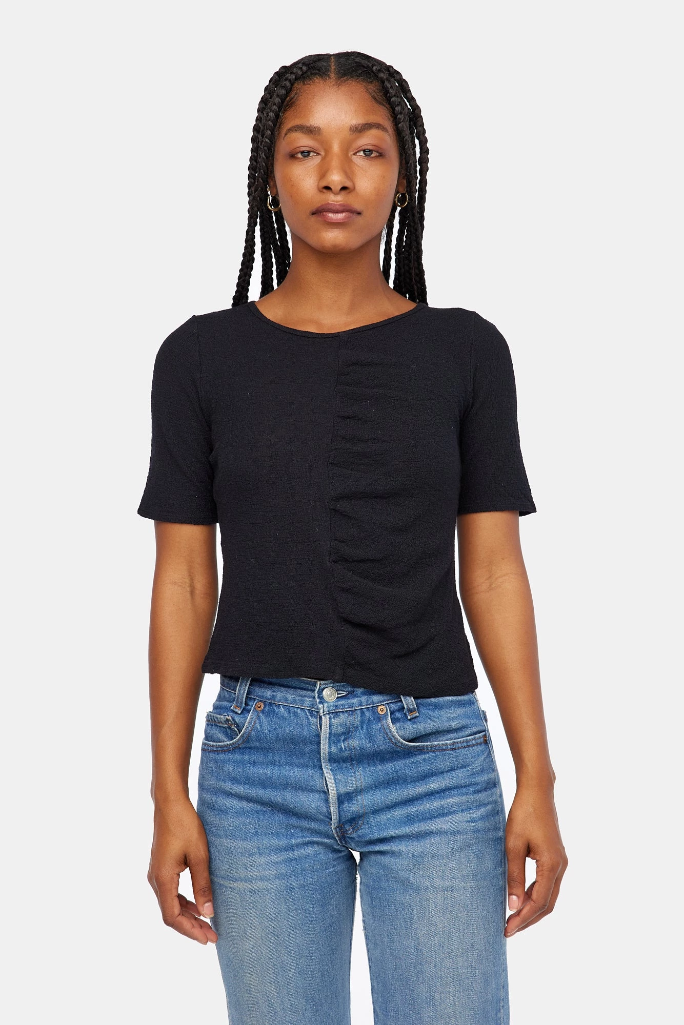 A basic tee with a twist. Fitted through the body with a ruching at center front seam. Made from our limited edition textured knit.