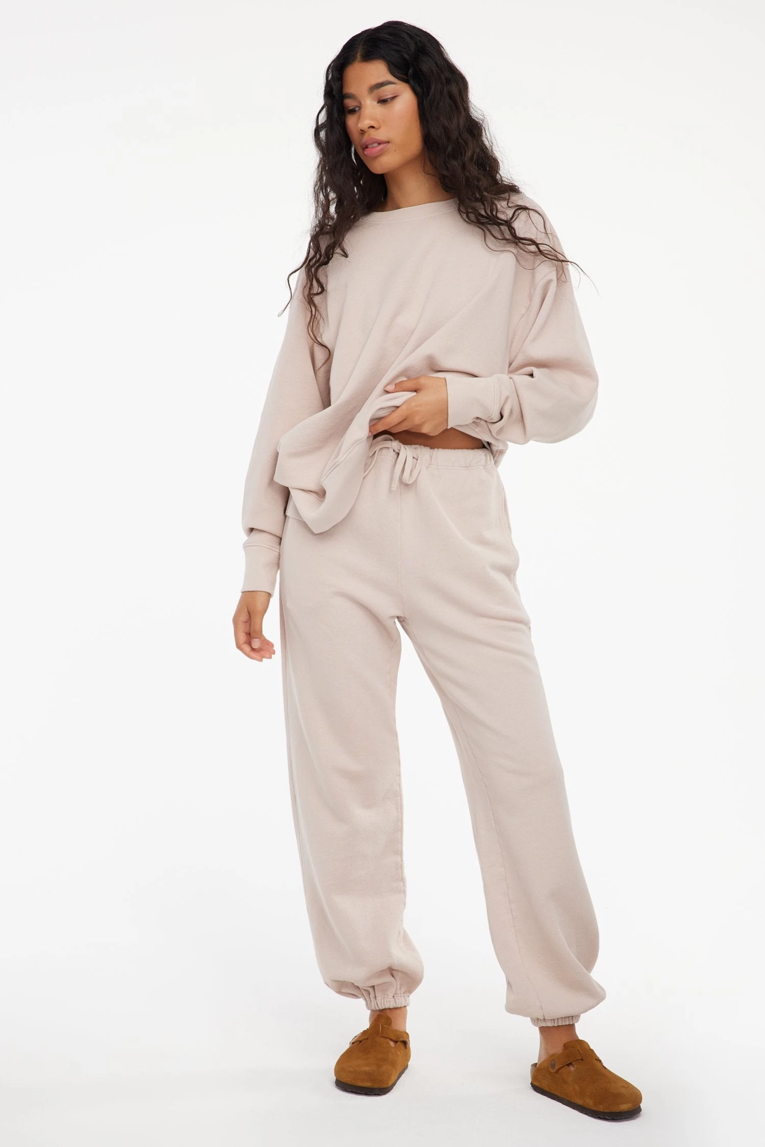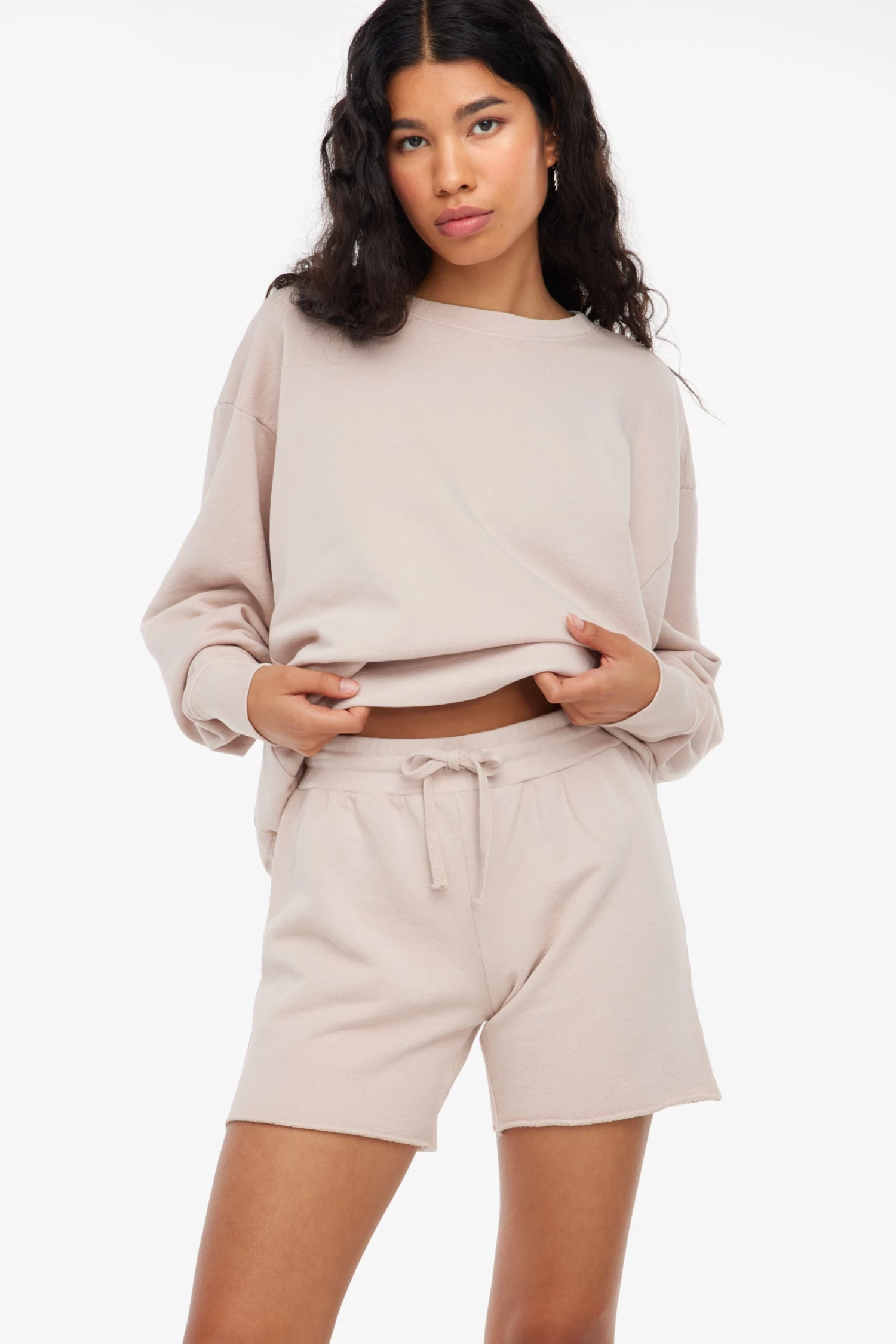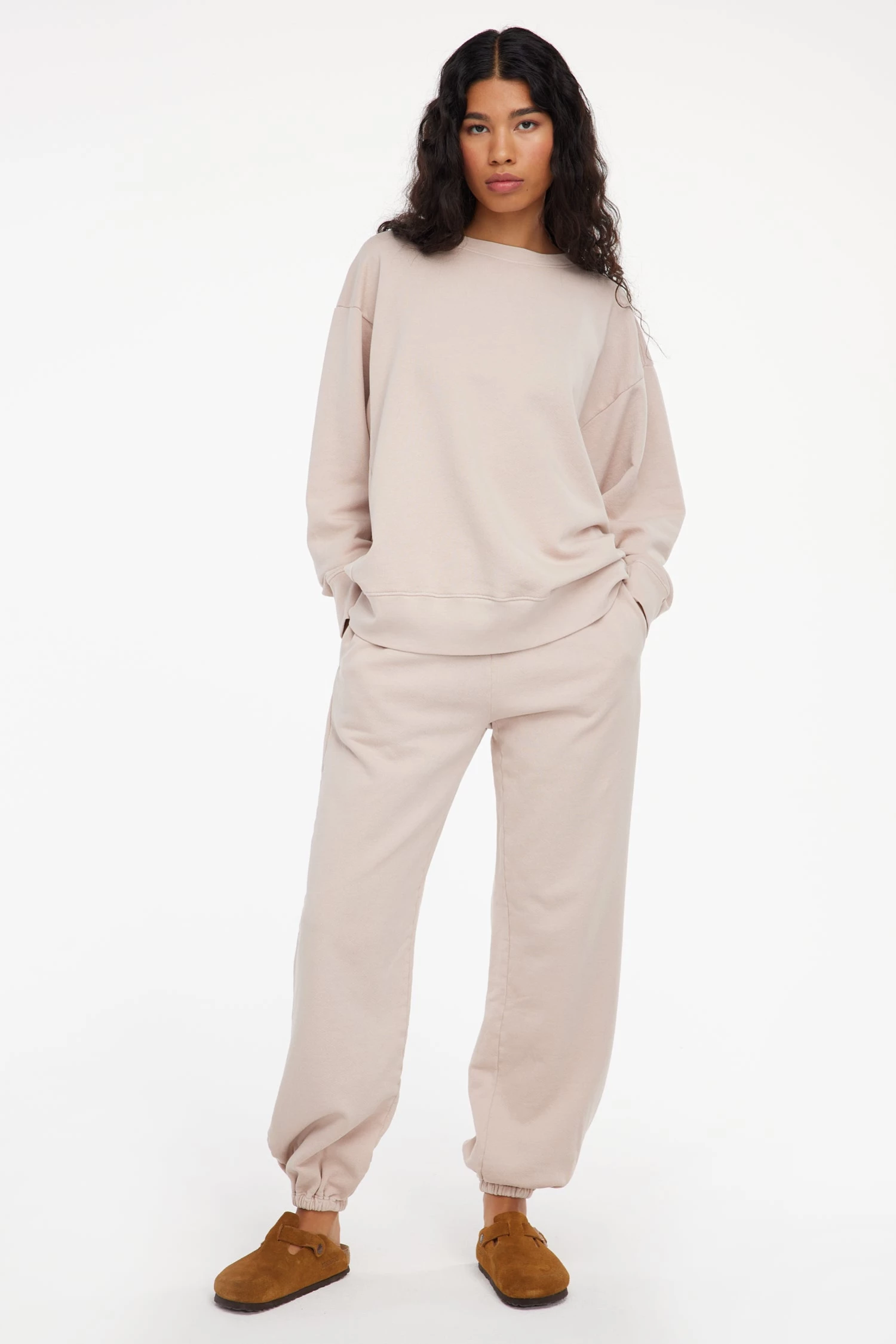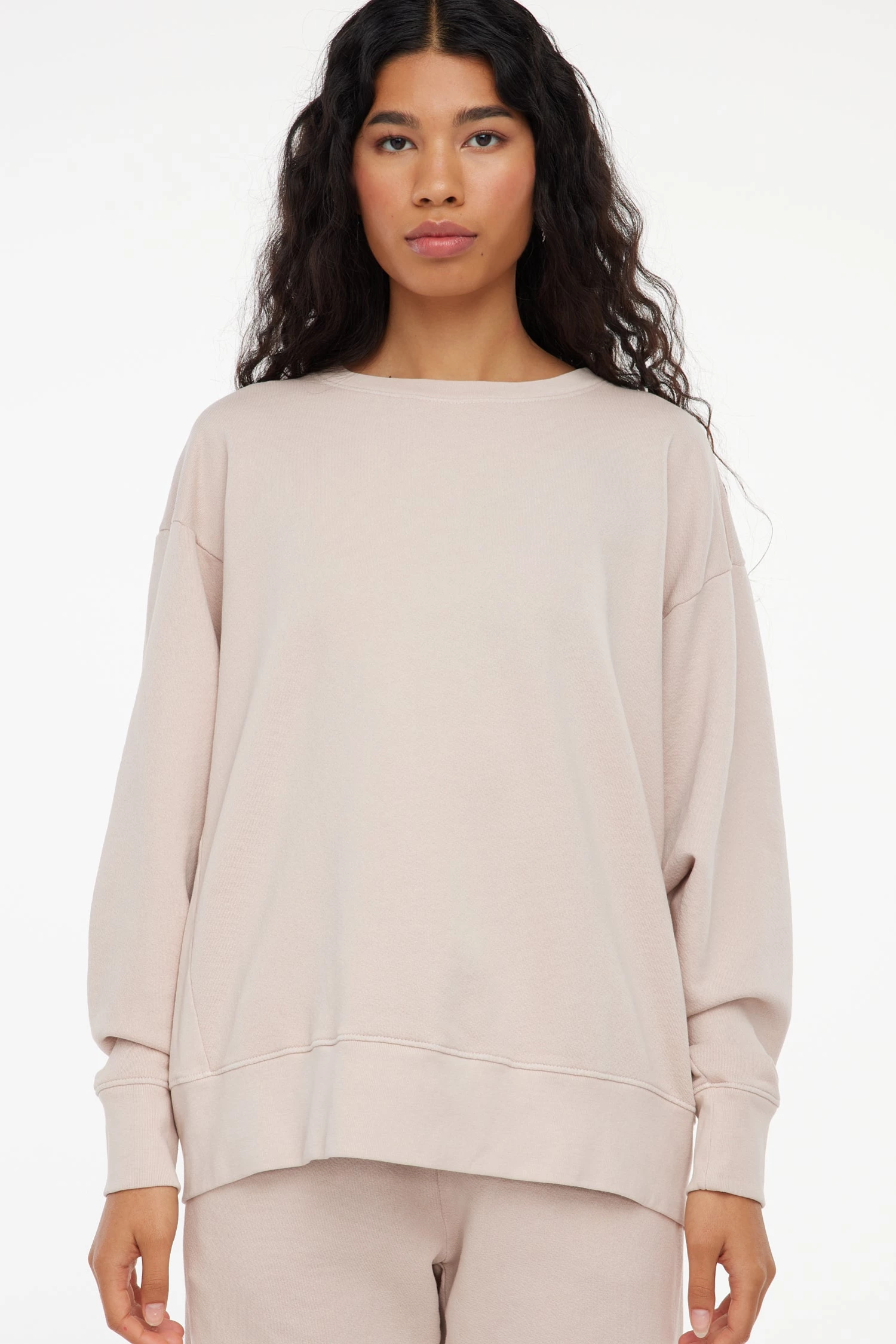 The Slater Sweatshirt, made from coziest organic cotton fleece. You’ll literally want to live in it. Oversized fit with dropped shoulders and rib contrast.