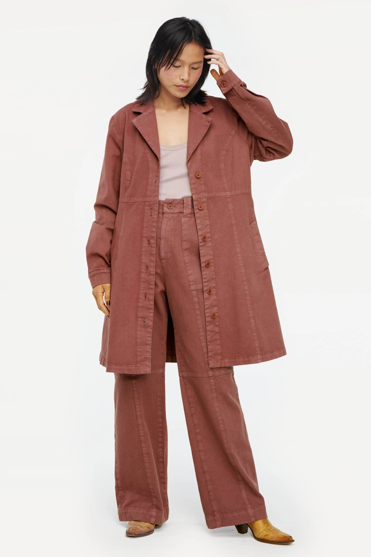 The perfect transitional jacket in a lightweight bull denim, garment dyed for a super soft hand feel. A longline 70s vibe with patchwork details and a slightly a-line silhouette. Pair with the Bryce Trousers for a match made in heaven.