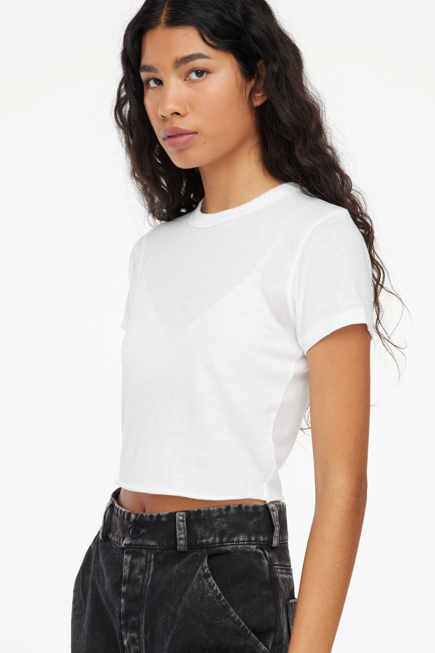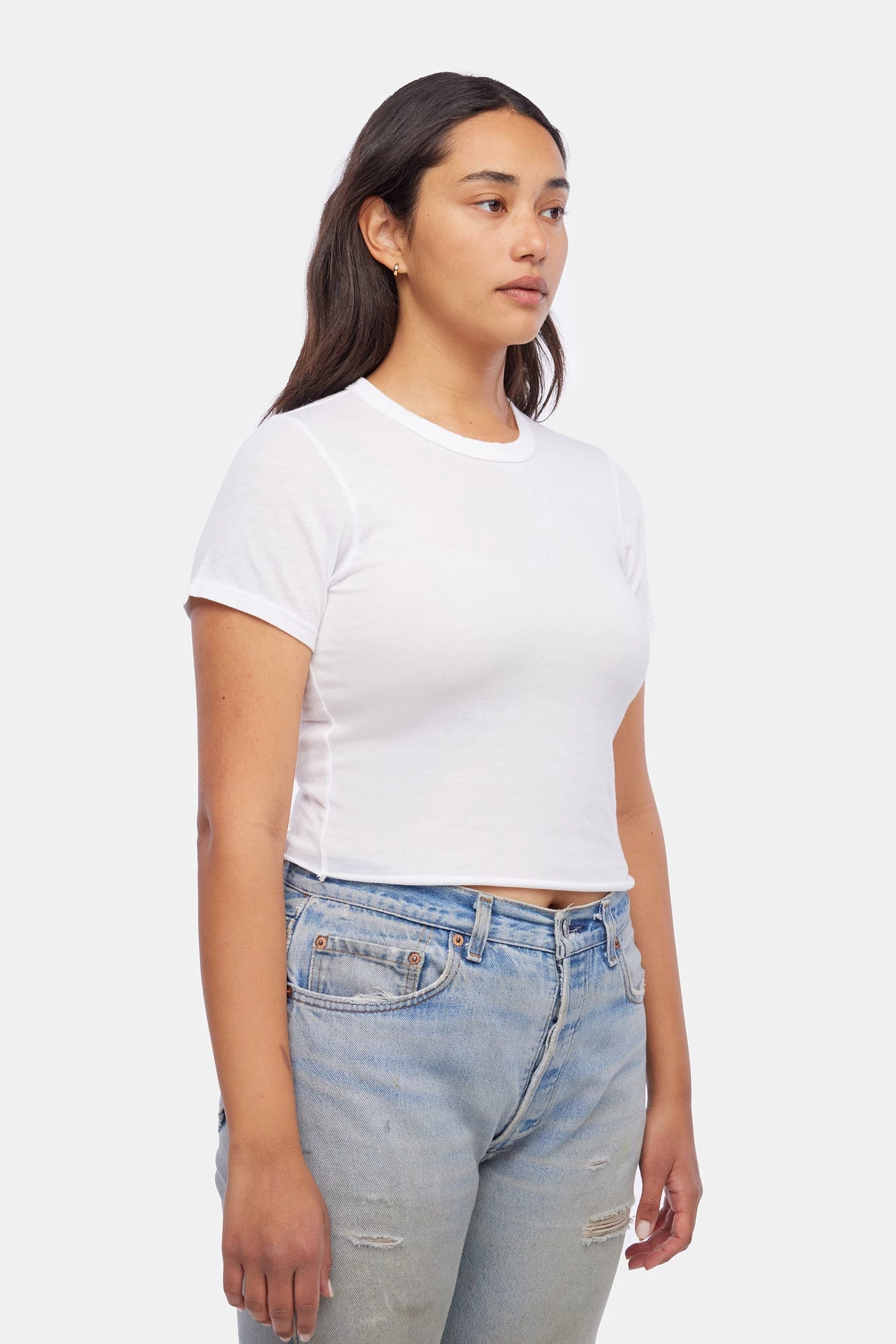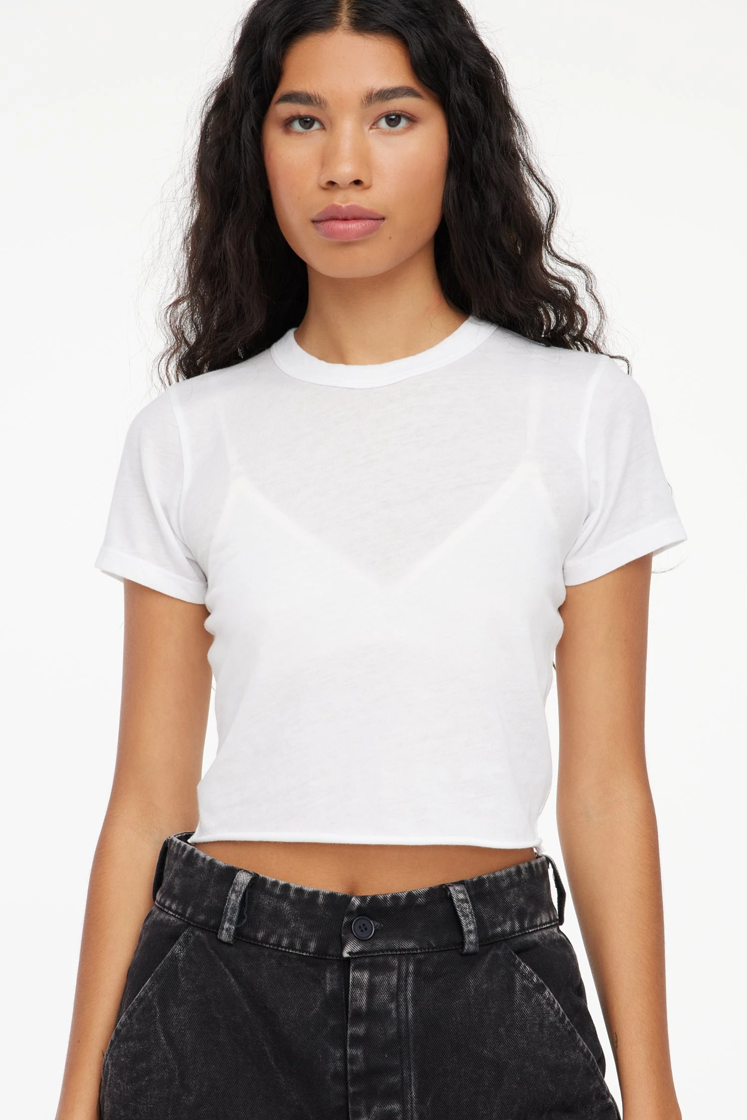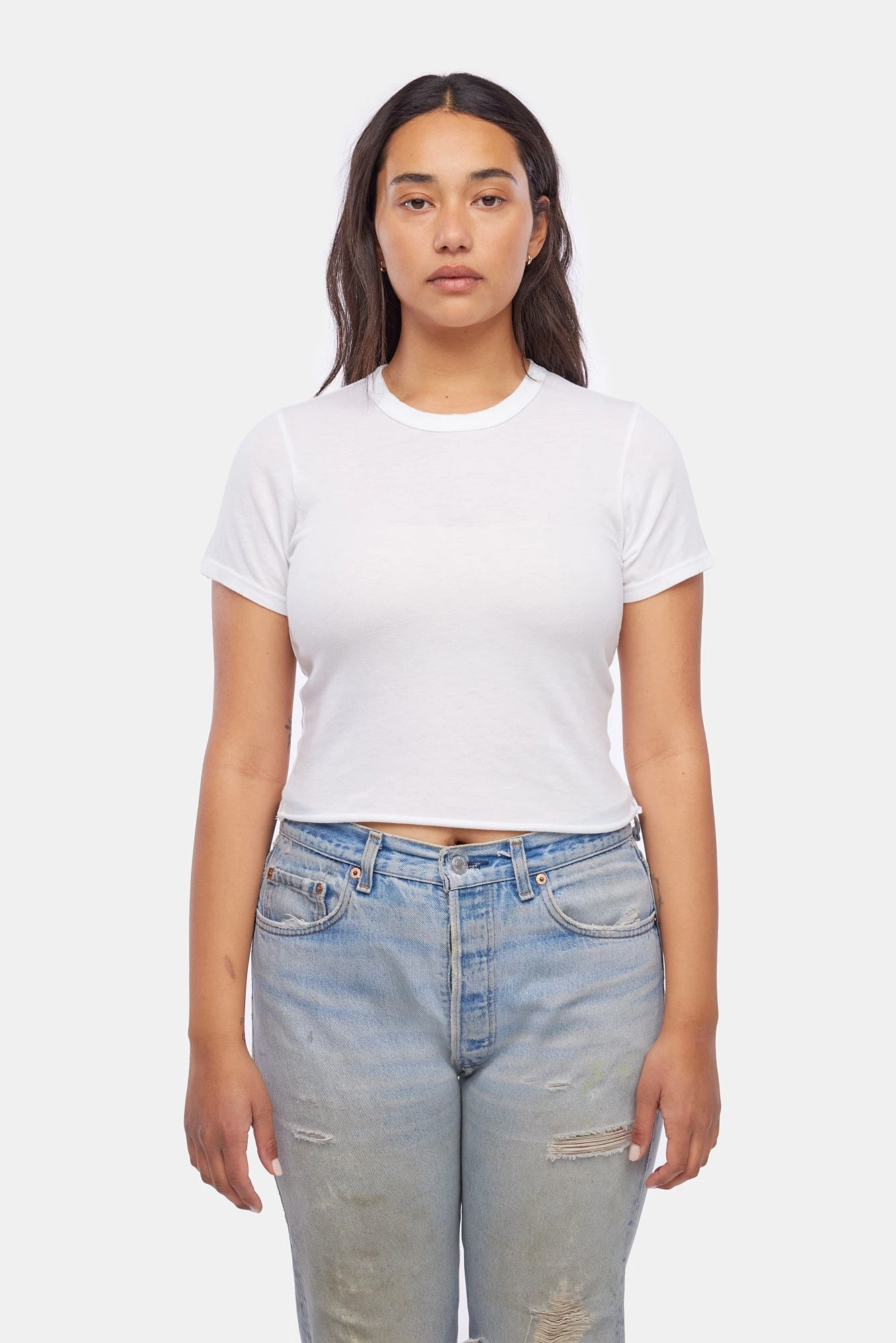 Hello baby tee of our dreams. This super soft shrunken tee is made of an organic cotton, recycled poly blend that gives it a slightly heathered look and the softest handfeel.