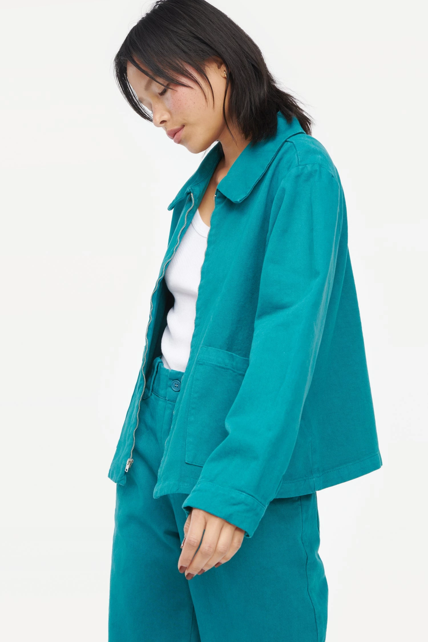 A cropped, boxy jacket with patch pockets and metal zipper closure. Made from structured bull denim, washed down for added softness. Pair with Cedar Trousers for a chic matching set.