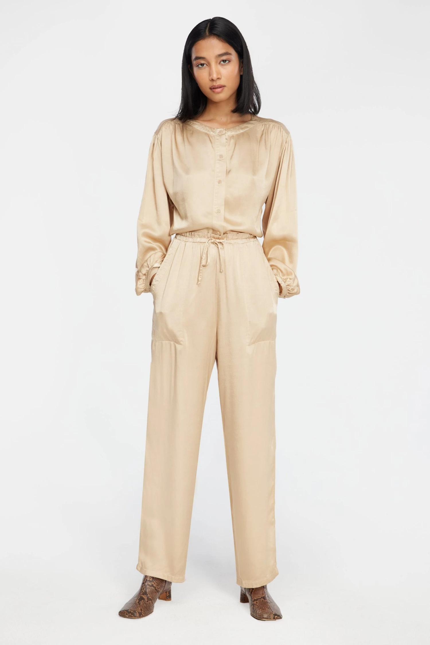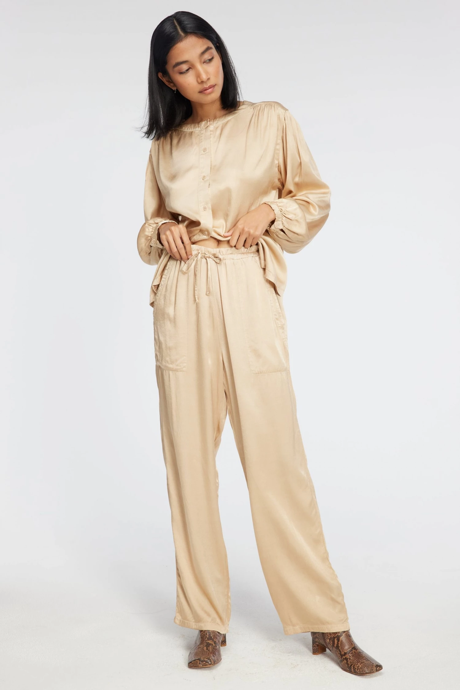 Our best satin pants yet. Full length with patch pockets and adjustable drawstring waist. Pair with the chic Devi Blouse for a dreamy tonal satin look.