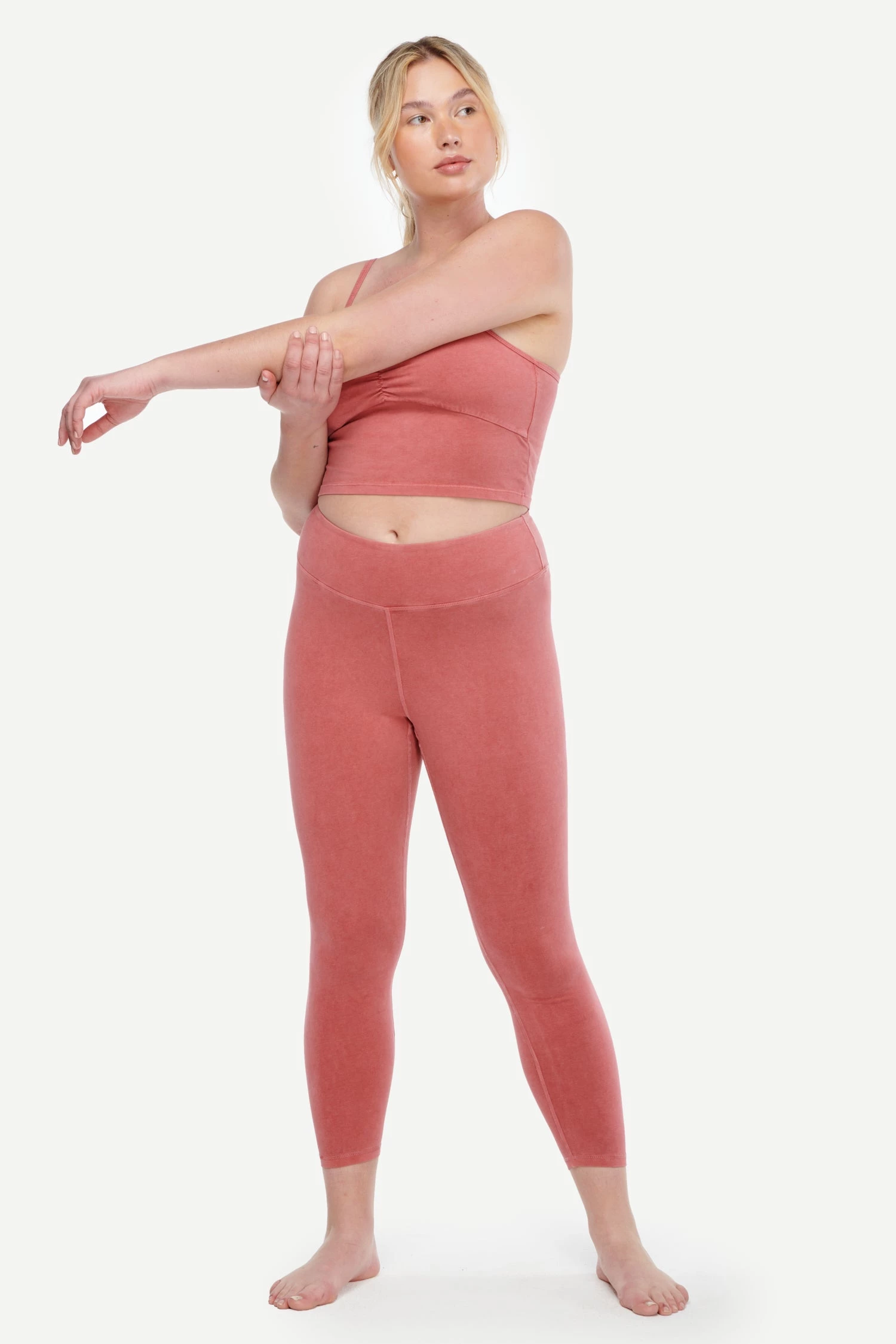 Garment dyed, high rise legging with flat lock stitching for added reinforcement at seams. The waist seam is curved at the sides to frame the slimmest part of your body. Super stretchy and buttery soft to support you throughout your lower impact workouts.